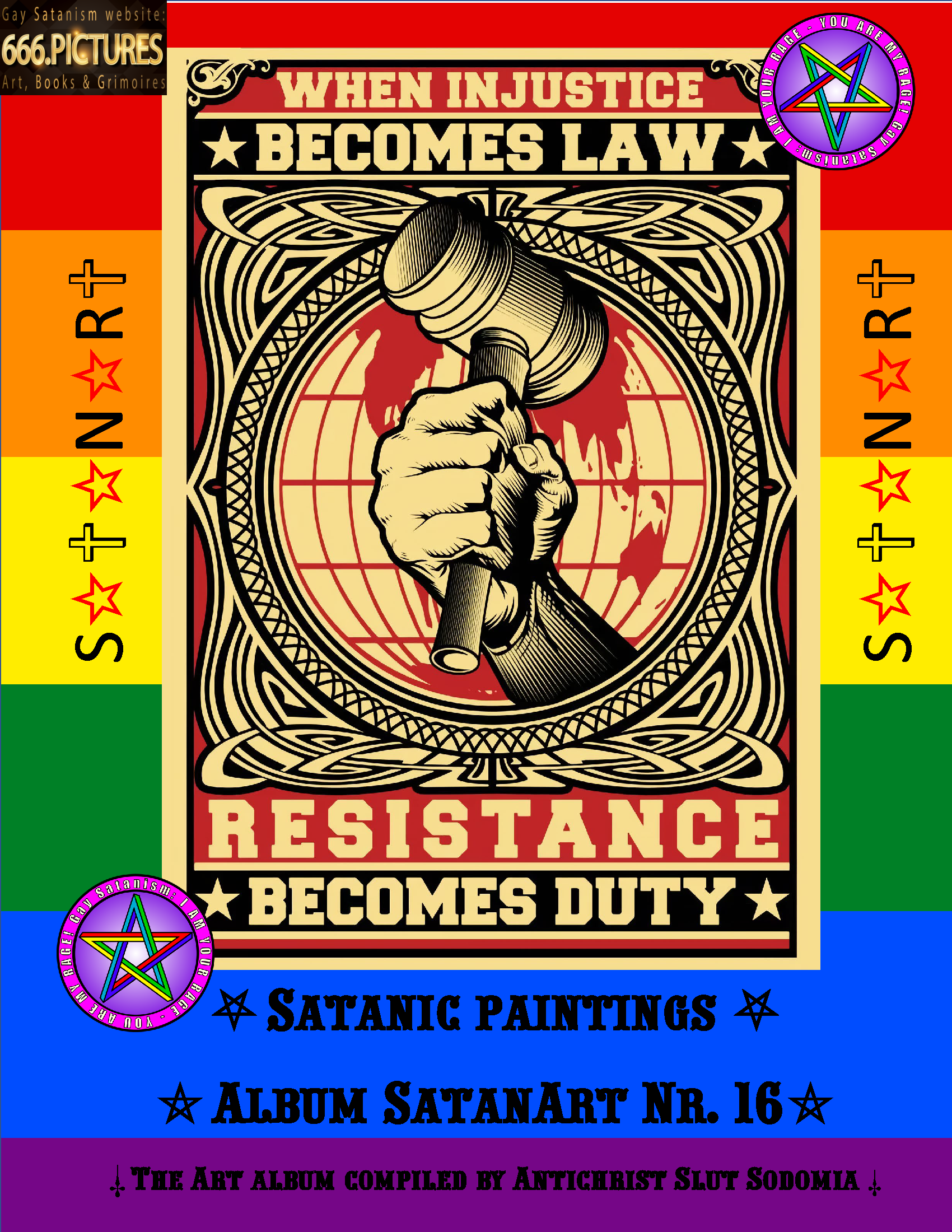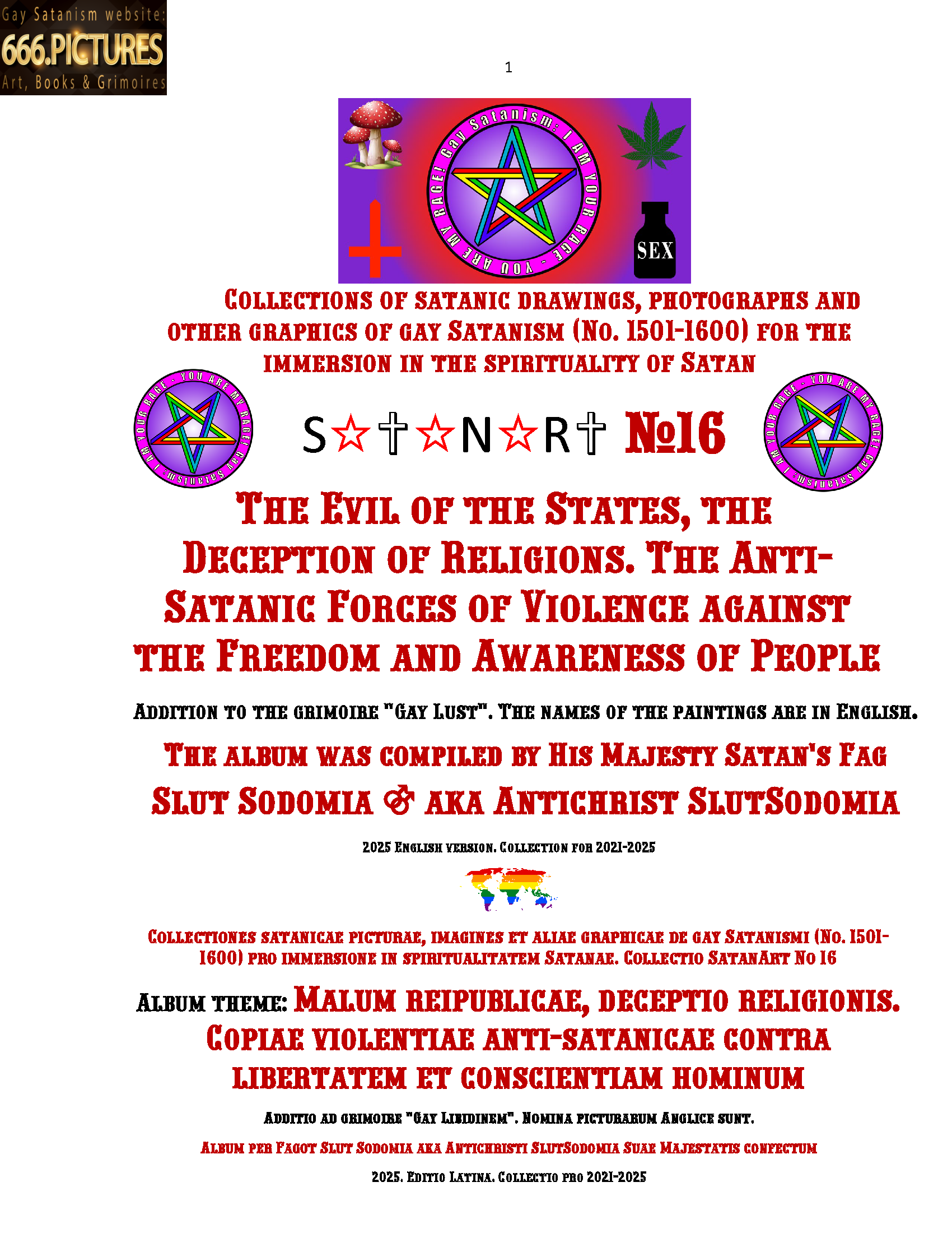 I dedicate the collection-album SatanArt №16 to the exposure of evil, understanding the technology of evil, the fight against evil and the influence of the forces of Satanism on the entropy of evil in our world and in Hell. The collection consists of various pictures, many of which are posters or placards. Slut Sodomia has given a large role to evil in the form of fascism SOCG and liars of religion. These forces of evil work “in squares”, involving billions of people around the world in their evil. The majority of the population of planet Earth do not resist evil and are its servants.