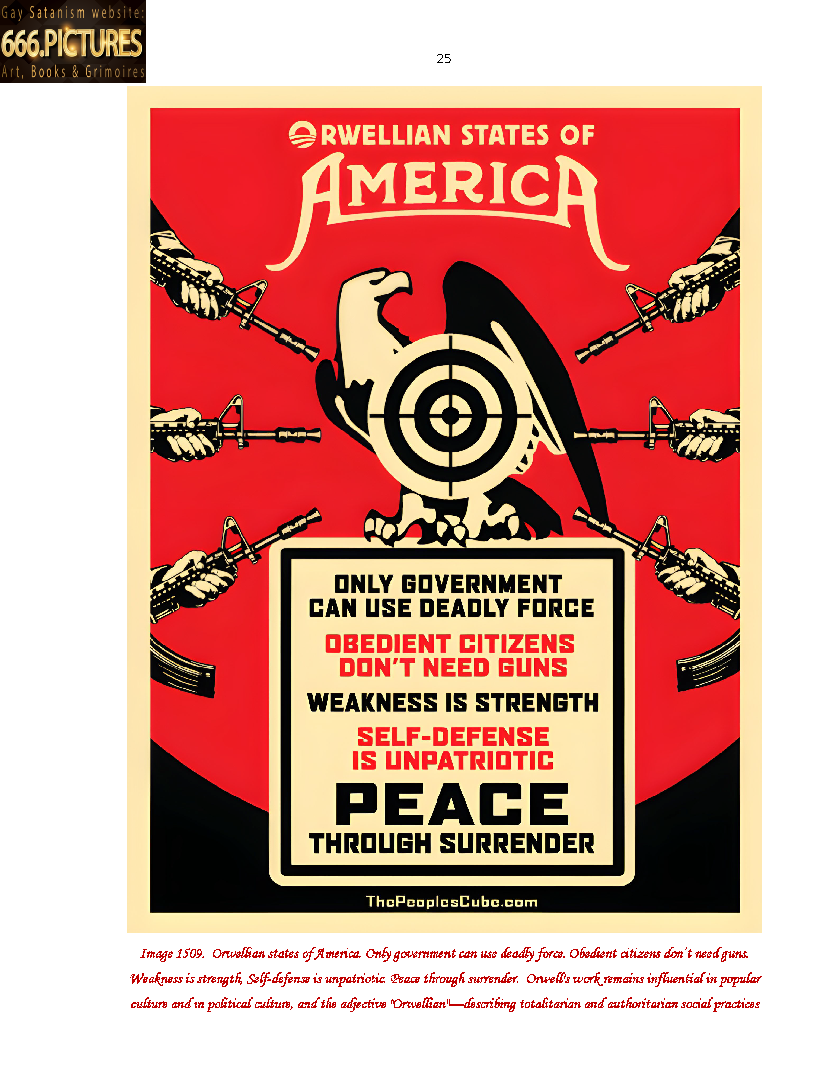 Image 1509. Orwellian states of America. Only government can use deadly force. Obedient citizens don’t need guns. Weakness is strength, Self-defense is unpatriotic. Peace through surrender. Orwell’s work remains influential in popular culture and in political culture, and the adjective “Orwellian”—describing totalitarian and authoritarian social practices 25