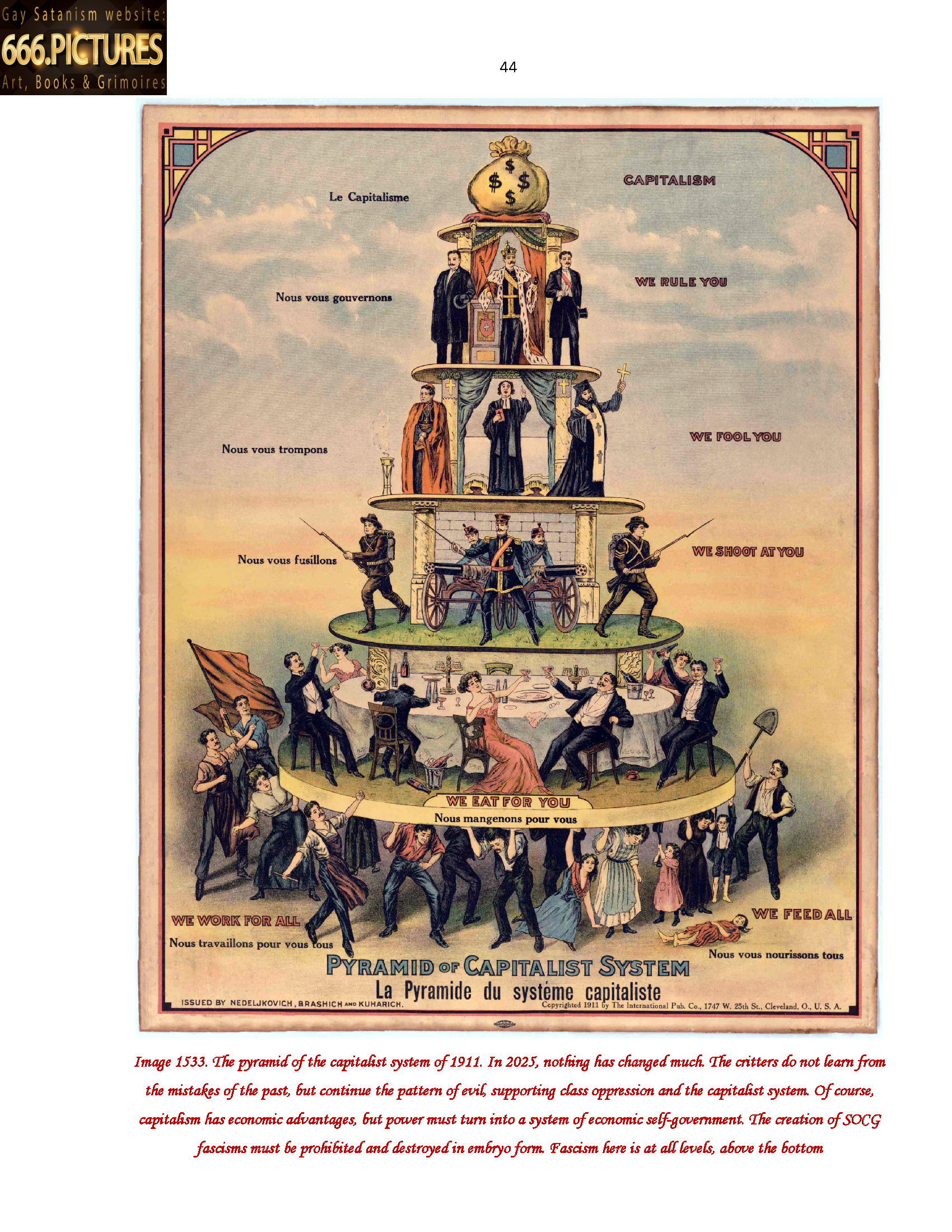 Image 1533. The pyramid of the capitalist system of 1911. In 2025, nothing has changed much. The critters do not learn from the mistakes of the past, but continue the pattern of evil, supporting class oppression and the capitalist system. Of course, capitalism has economic advantages, but power must turn into a system of economic self-government. The creation of SOCG fascisms must be prohibited and destroyed in embryo form. Fascism here is at all levels, above the bottom 44