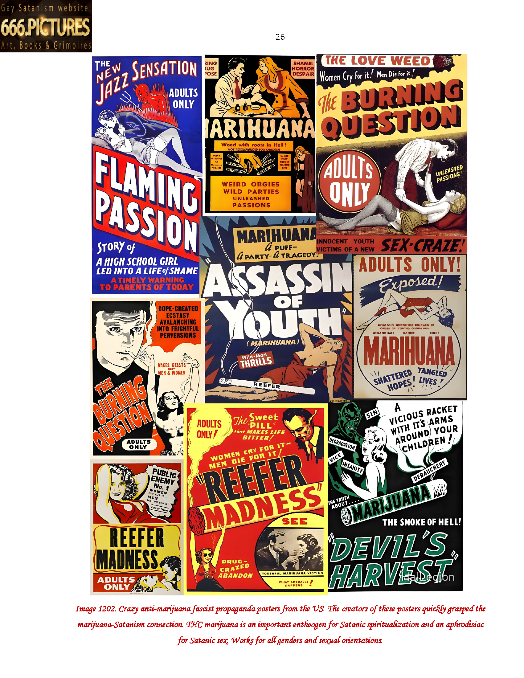 I dedicate the collection-album SatanArt №17 to posters and placards on the theme of marijuana, 420 grass, ganja, Mary Jane, psychedelic hemp. In the album I placed old anti-marijuana posters, because they clearly show the connection between Satanism and the magic grass. Now, in 2025, 20 nations of the world and their governments have legalized the use and cultivation of psychedelic hemp. In the most fascist GOPGs of our world, marijuana is completely prohibited and its cultivation and use is punishable by long prison terms. Marijuana is a grass for getting closer to Satan and Satanism. Marijuana gives general spirituality to people and opens a connection with the External Information Field. All the creatures of our world who punish people for psychedelics, entheogens, tormenting them with prisons and fines will be subjected to special tortures in Hell. Those creatures who prohibit the magic flowers of marijuana or punish for growing and using hemp THC are criminals, enemies of Satan and Satanists. These creatures are also enemies of the freedom of humanity, not allowing people to touch the useful entheogen. The creatures of evil forbid you freedom, flowers and spiritualization by the Spirit of Satan.