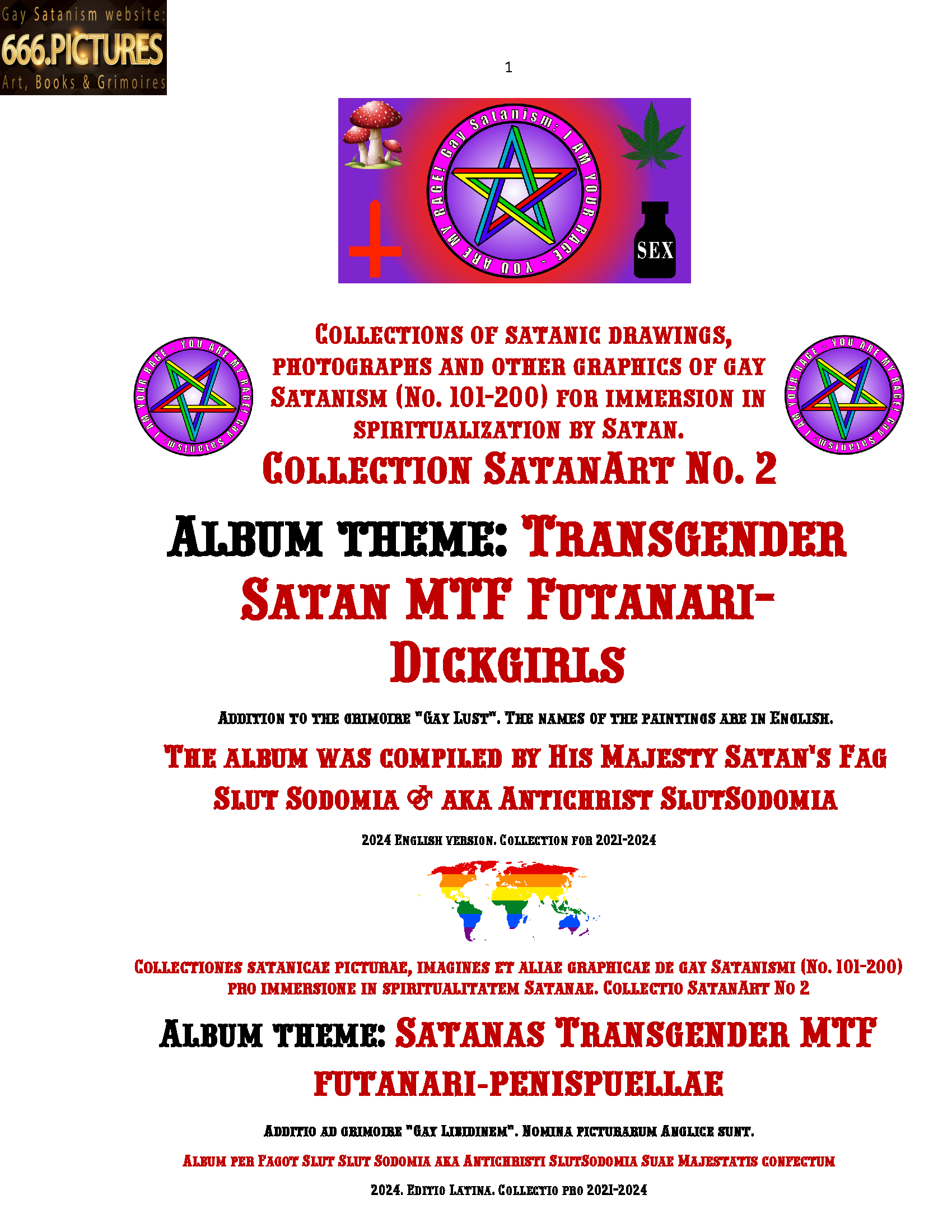 I dedicate the collection-album SatanArt No. 2 to MTF transgender transition and all the members of our large LGBTQ+ community of Satanists. Transgender transition is part of Satanism and part of the greater soul of Satan. Eliphas Levi’s Baphomet is depicted as an MTF trance. This is not an accident. Satan can take any form and, of course, combines all sexual genders and lust of any direction in himself. Satanists strive to be like their Spiritualizer, Teacher and Source of lust. Converting a boy or man into an MTF trans is not just a process of changing gender. This is a much deeper process of satanization, when a passive pederast becomes a conscious Satanist. The collection-album SatanArt No. 2 is dedicated specifically to the image of MTF Satan-trance, and not to ordinary dick girls. A separate collection SatanArt No. 11 will be dedicated to the beautiful goddesses-Satanists. Let the release of the album Antichrist Slut Sodomia SatanArt No. 2 contribute to the development of transgender transition throughout the world. The more bottom homosexuals consciously turn into dickgirls, the better for Satanism and the more light, goodness and lust there will be in our world. The more damage will be done to evil throughout the world.