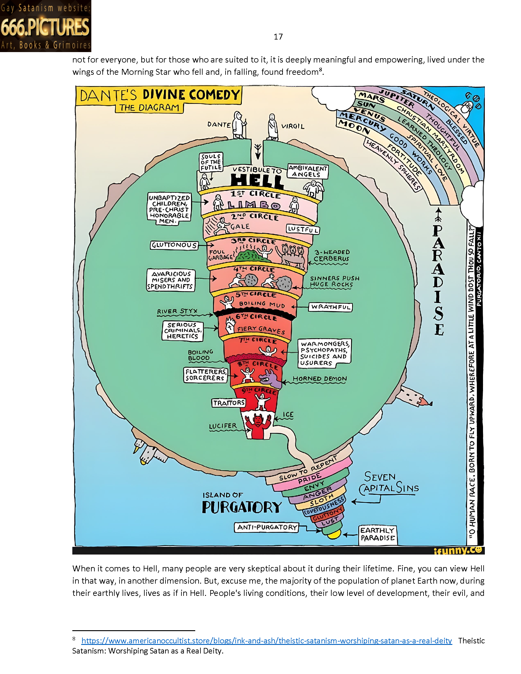The theme of an “afterlife” Hell exists in the traditions of many religions and sects. Many sects base their entire doctrine on salvation from the torments of Hell or on prophecies of the imminent “end of the world.” Gay Satanism, of course, is more focused on the sexual liberation of all people, on LGBTQ+ sexuality, and on resistance to the evildoers of our world. This is the main message of gay Satanism, from the Antichrist Slut Sodomia. This is the atheistic part of gay Satanism. However, Spiritual Satanism occupies a significant place in gay Satanism, i.e., the spiritualization of Satanists by the Spirit of Satan-Lucifer from another dimension called Hell. Therefore, I consider gay Satanism a laconic symbiosis of atheistic Satanism and spiritual Satanism, against a vivid backdrop of debauchery and sexual freedom. The theme of Hell is important to Gay Satanism. If there were no retribution for the evil of our world, we Satanists would have no hope. But Spiritual Satanists know that the Spirits of Hell exist and are connected to us on a quantum level through the EIQF.