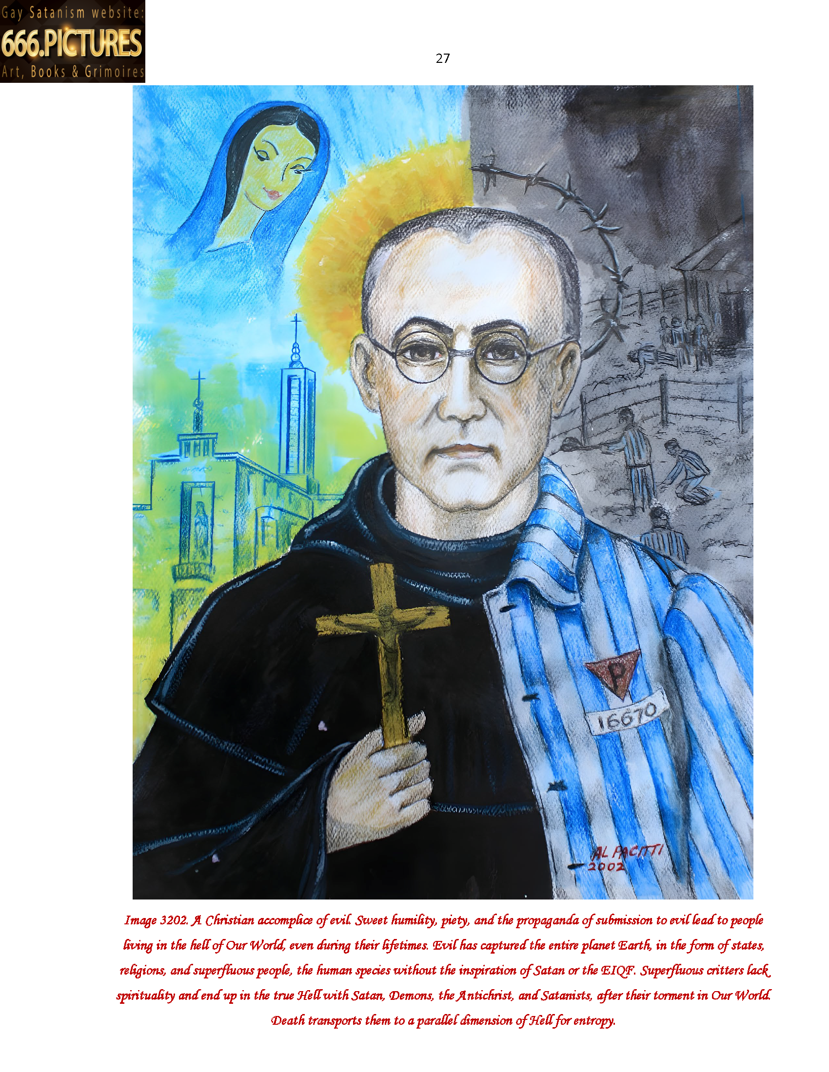 Image 3202. A Christian accomplice of evil. Sweet humility, piety, and the propaganda of submission to evil lead to people living in the hell of Our World, even during their lifetimes. Evil has captured the entire planet Earth, in the form of states, religions, and superfluous people, the human species without the inspiration of Satan or the EIQF. Superfluous critters lack spirituality and end up in the true Hell with Satan, Demons, the Antichrist, and Satanists, after their torment in Our World. Death transports them to a parallel dimension of Hell for entropy. 27