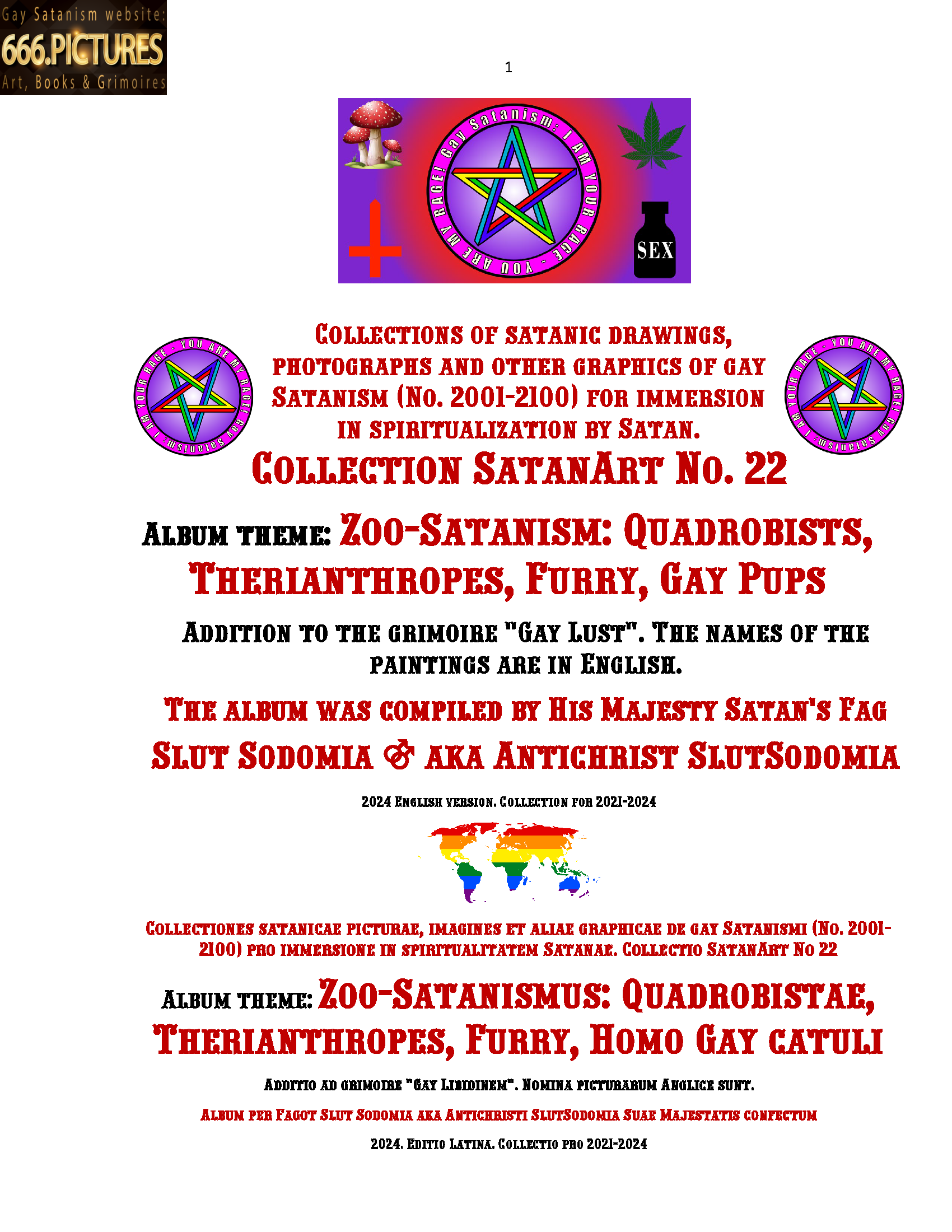 Man is an animal. This is our basis of existence on planet Earth. All who deny this are liars and hypocrites. Antichrist Slut Sodomia decided to create the album SatanArt №22 in an accelerated manner, because in Mordor, i.e. in Russia, the evil of the SOCG threatens children who do aerobics in the style of animals and participate in fandom communities of therianthropes, furries, gay puppies. Putin’s Mordor of the Russian Pederation wants to prohibit and punish children by imposing their idiotic prohibitions, restrictions, morals and rules of conduct on them. The population of Russia consists of 95% of evil creatures who approve of such prohibitions of their SOCG. This funny nastiness of evil from the Russian Pederation looks like a desire to find more internal enemies of the Putinist regime, after gays and LGBTQ+. The issues of quadrobers are considered by the evil of Mordor at their meetings of SOCG gang members in various parliaments, bureaucrats’ offices and at propaganda sabbaths of the forces of evil on Russian TV. I dedicate the SatanArt album #22 to Zoo-Satanism and Zoo-Satanists: quadrobists (quadrobers), therianthropes, furries and gay puppies of any age, although this applies more to children and teenagers. This album is the seventh, in order of its creation, after 1, 15, 2, 3, 21, 5 album numbers).