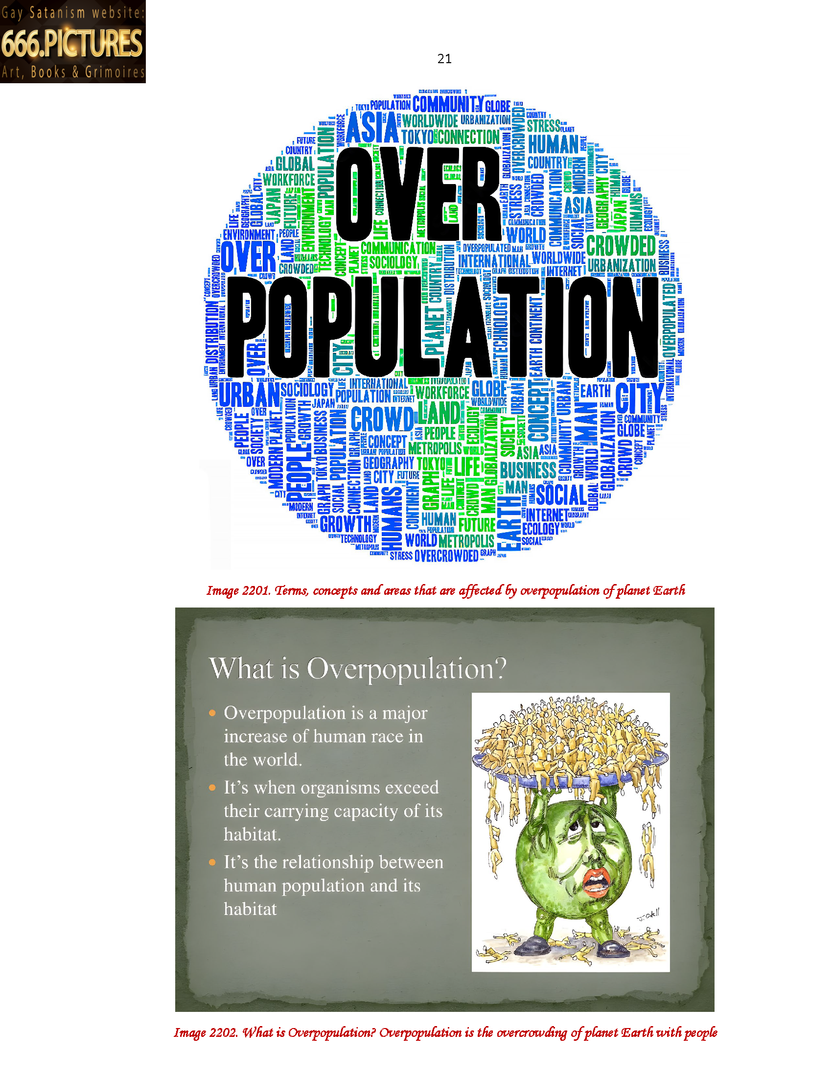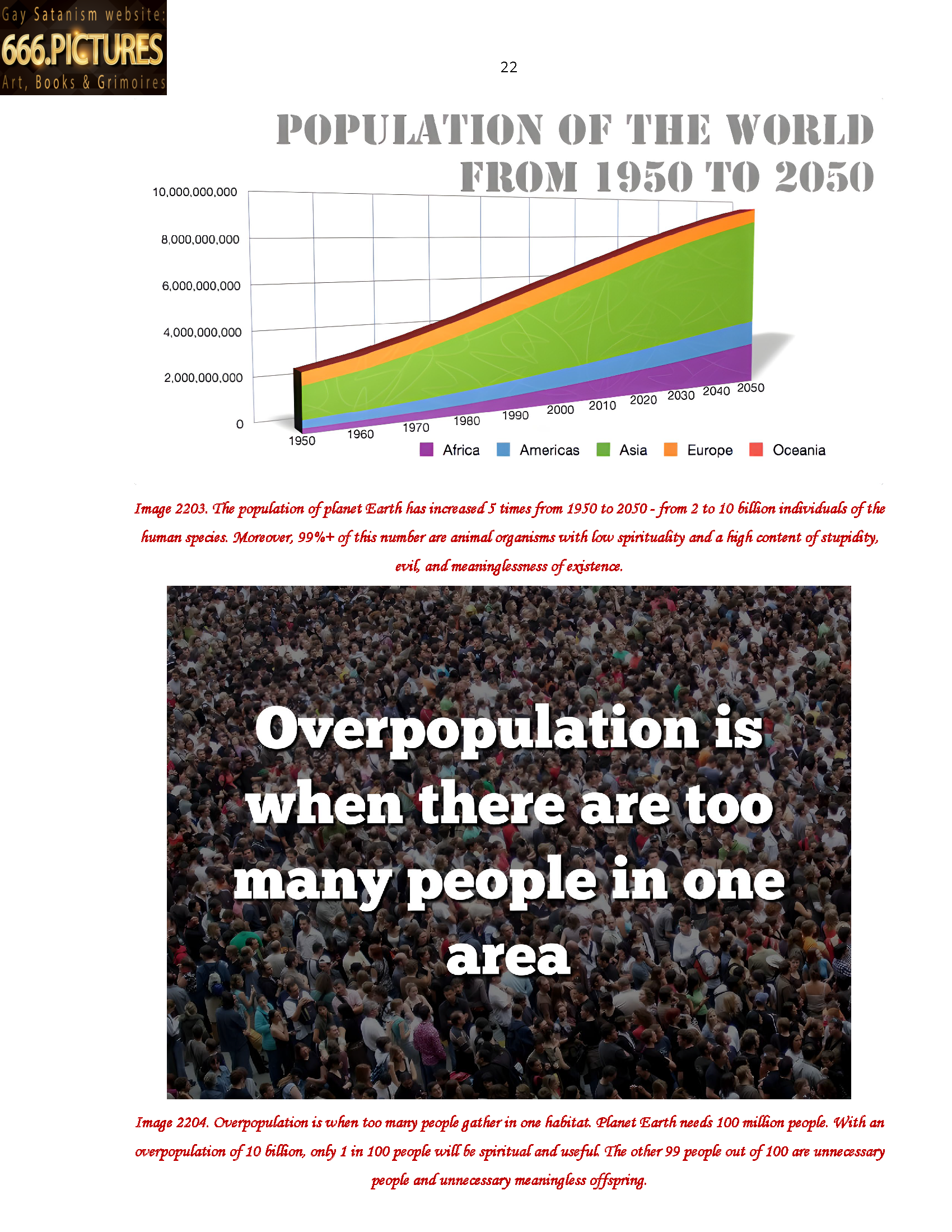 Image 2204. Overpopulation is when too many people gather in one habitat. Planet Earth needs 100 million people. With an overpopulation of 10 billion, only 1 in 100 people will be spiritual and useful. The other 99 people out of 100 are unnecessary people and unnecessary meaningless offspring. 22