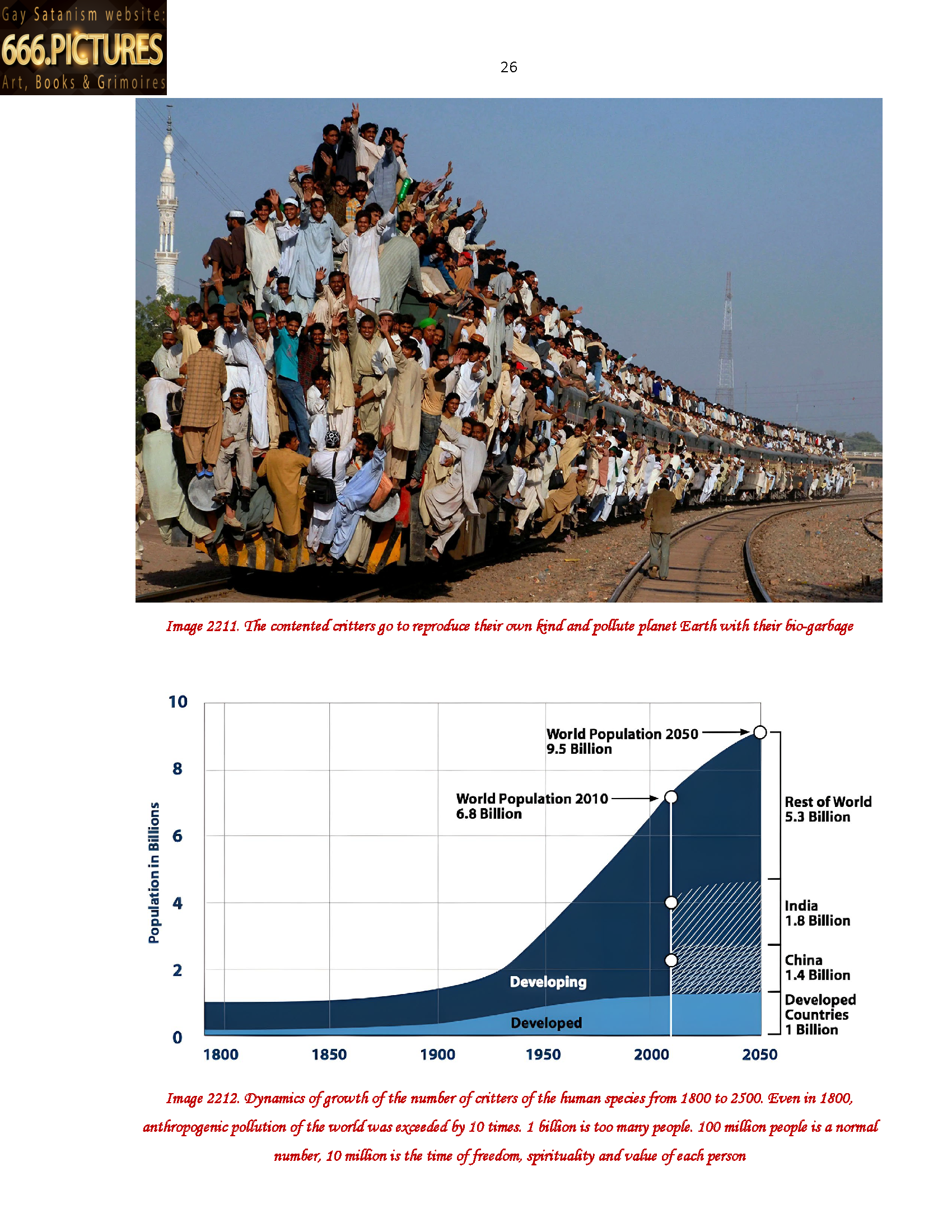 I dedicate the collection-album SatanArt №23 to one of the main problems of good spiritualization of people inhabiting planet Earth. The main problem is the excessive number of superimposed evil critters who do not have good spiritualization at birth and cannot receive it during adulthood. At the same time, I do not even mean satanic spiritualization for the masses of people, but I would simply like the quality of people to be higher than the animal level or the level of stupid consumption of goods with resources. It is the overpopulation of planet Earth that is the reason why satanic spiritualization is a rarity in our world. A huge number of empty people have been superimposed, who are simply bio-bodies without real spiritualization by awareness. About 90% of the planet’s population lives the life of animals and pollutes the planet with their presence and their secondary anthropogenic pollution. The solution to this problem can be the phrases: stop being fruitful and multiplying! Critters, stop breeding your own kind of freaks! Satanists, childfree people, feminists and antinatalists are implementing these simple slogans. Partially, gays and many people of the LGBTQ+ community who are not inclined to give birth to new human offspring are implementing these programs. The evil of our world, fascists, religions and the SOCG want the critters to spawn and multiply in numbers. Evil wants the critters of the human species to be stupid, fooled and without significant spirituality. Evil is afraid that there is a significant number of spiritual Satanists in the world. When there are more than 10% of Satanists from the population of planet Earth, the power of evil will come to an end. Now this figure is much lower and is less than 1% among the best peoples of the world and about 0.001% among wild monkeys of the human species. I examined the topic of spiritualization of the population of planet Earth in more detail in the SatanArt album #19 “Satanic spiritualization in the quantum world of the External Information Field” and in the main grimoire of gay Satanism “Gay lust”.
