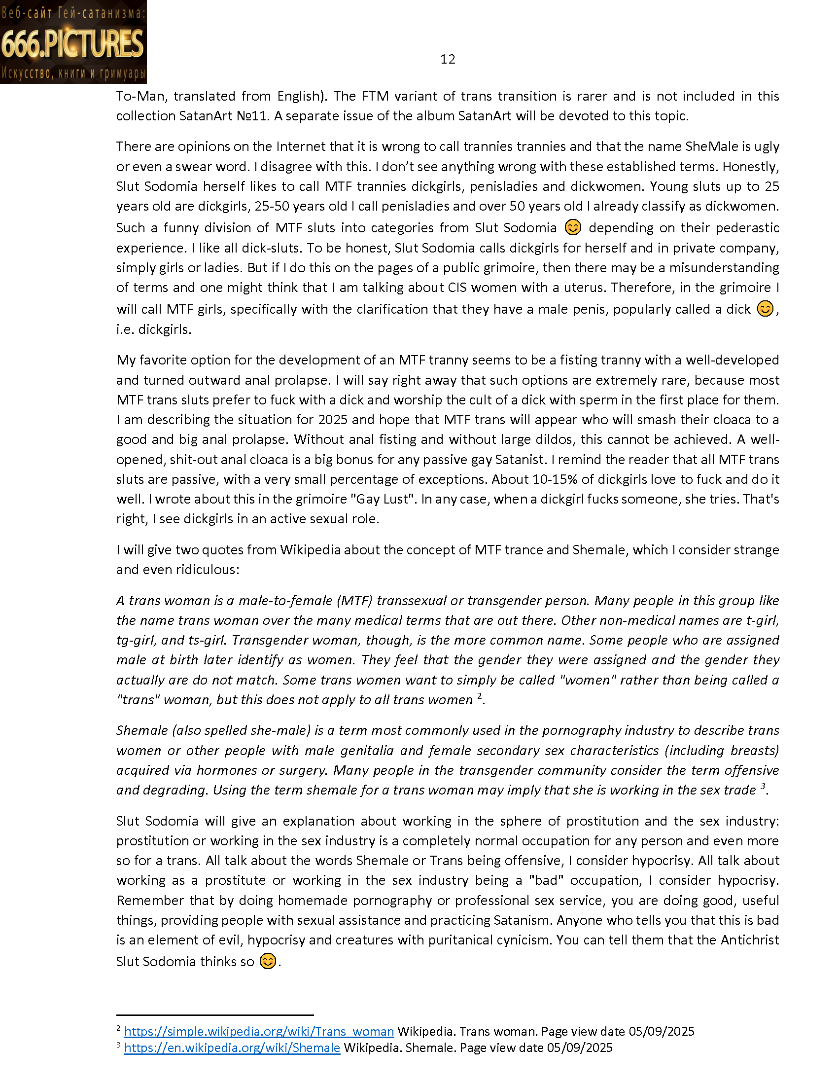 There are opinions on the Internet that it is wrong to call trannies trannies and that the name SheMale is ugly or even a swear word. I disagree with this. I don’t see anything wrong with these established terms. Honestly, Slut Sodomia herself likes to call MTF trannies dickgirls, penisladies and dickwomen. Young sluts up to 25 years old are dickgirls, 25-50 years old I call penisladies and over 50 years old I already classify as dickwomen. Such a funny division of MTF sluts into categories from Slut Sodomia 😊 depending on their pederastic experience. I like all dick-sluts. To be honest, Slut Sodomia calls dickgirls for herself and in private company, simply girls or ladies. But if I do this on the pages of a public grimoire, then there may be a misunderstanding of terms and one might think that I am talking about CIS women with a uterus. Therefore, in the grimoire I will call MTF girls, specifically with the clarification that they have a male penis, popularly called a dick 😊, i.e. dickgirls.