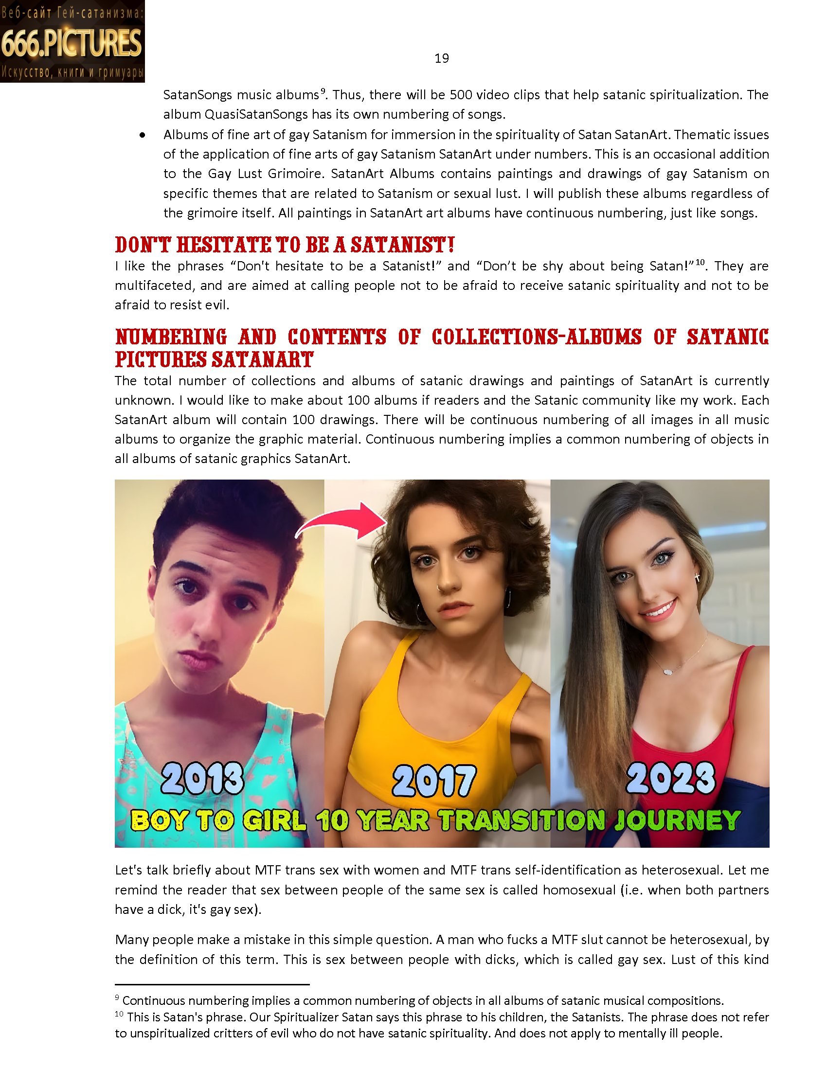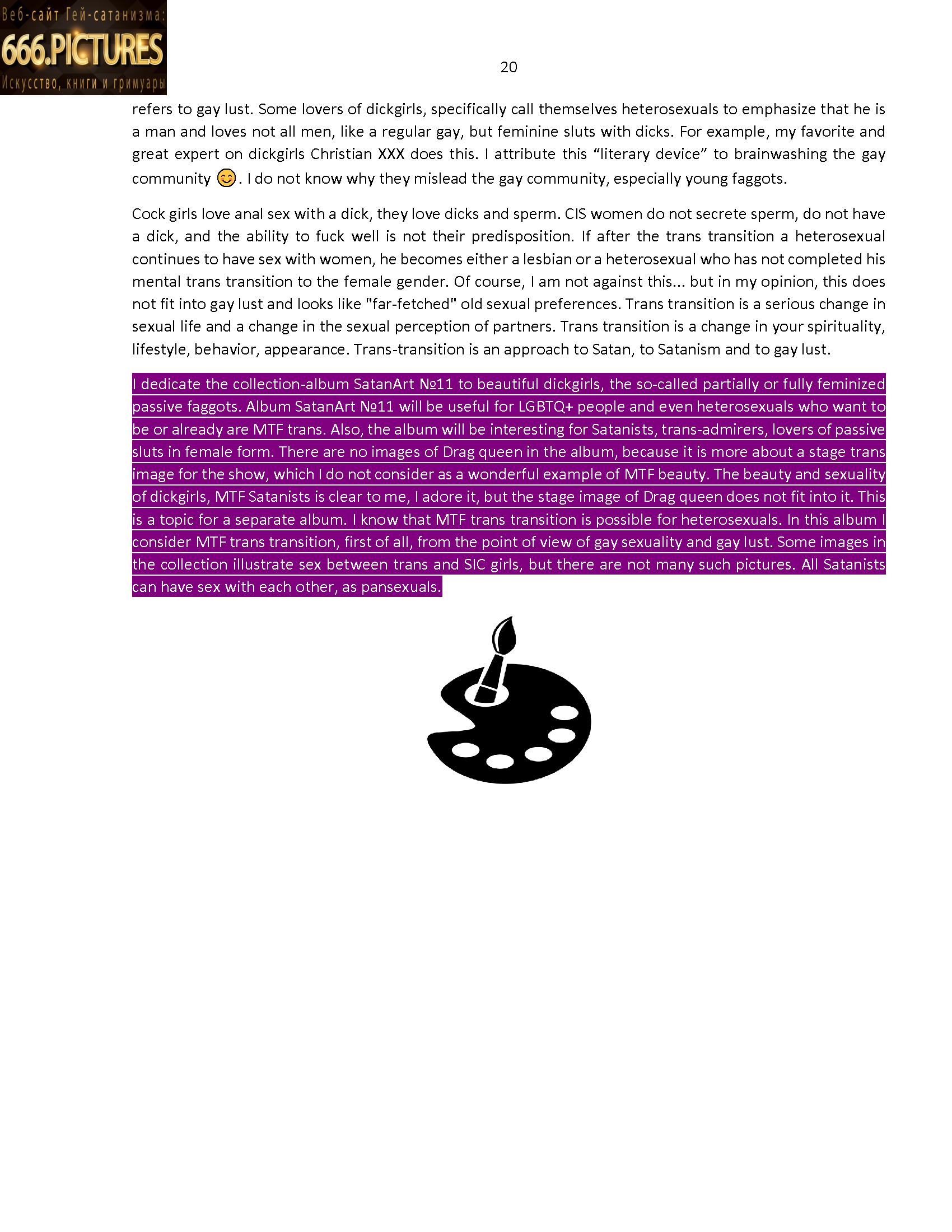 I dedicate the collection-album SatanArt №11 to beautiful dickgirls, the so-called partially or fully feminized passive faggots. Album SatanArt №11 will be useful for LGBTQ+ people and even heterosexuals who want to be or already are MTF trans. Also, the album will be interesting for Satanists, trans-admirers, lovers of passive sluts in female form. There are no images of Drag queen in the album, because it is more about a stage trans image for the show, which I do not consider as a wonderful example of MTF beauty. The beauty and sexuality of dickgirls, MTF Satanists is clear to me, I adore it, but the stage image of Drag queen does not fit into it. This is a topic for a separate album. I know that MTF trans transition is possible for heterosexuals. In this album I consider MTF trans transition, first of all, from the point of view of gay sexuality and gay lust. Some images in the collection illustrate sex between trans and SIC girls, but there are not many such pictures. All Satanists can have sex with each other, as pansexuals.