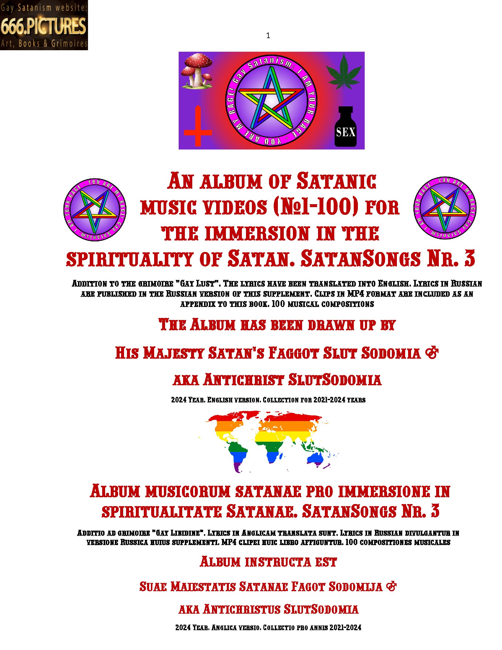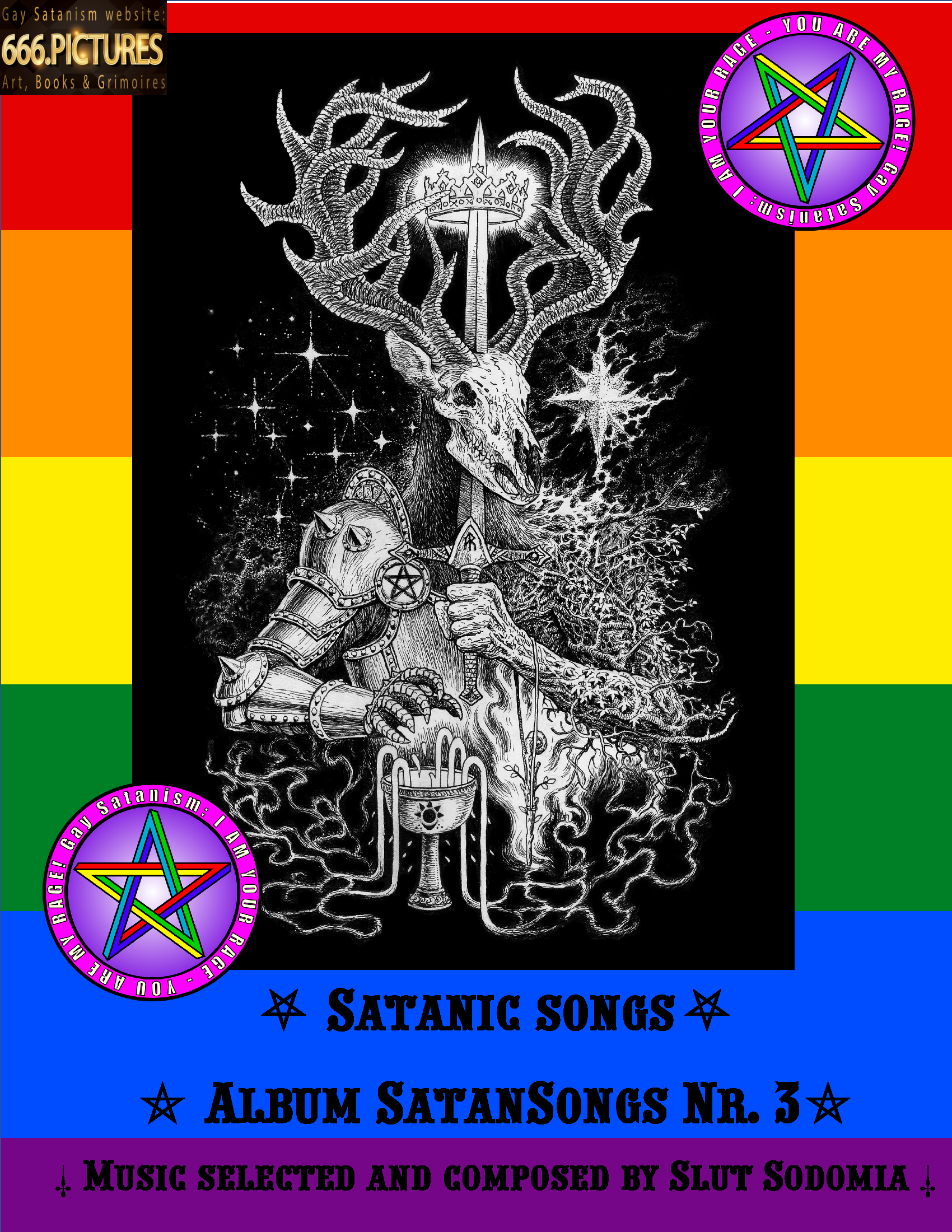 This is a selection of songs and videos from the Antichrist Slut Sodomia. Songs and videos in the SatanSongs albums help to become inspired by Satan, free the mind, and fill a person with harmony and awareness. Therefore, I recommend such clips for deepening your spirituality or acquiring spiritualization by Satan. Addition to the grimoire “Gay Lust”. The lyrics have been translated into English.  In total there will be 5+ collections of satanic videos SatanSongs with 100 tracks each, plus there will also be an album of quasi-satanic songs QuasiSatanSongs about love, romance, lust. There is continuous numbering of tracks…