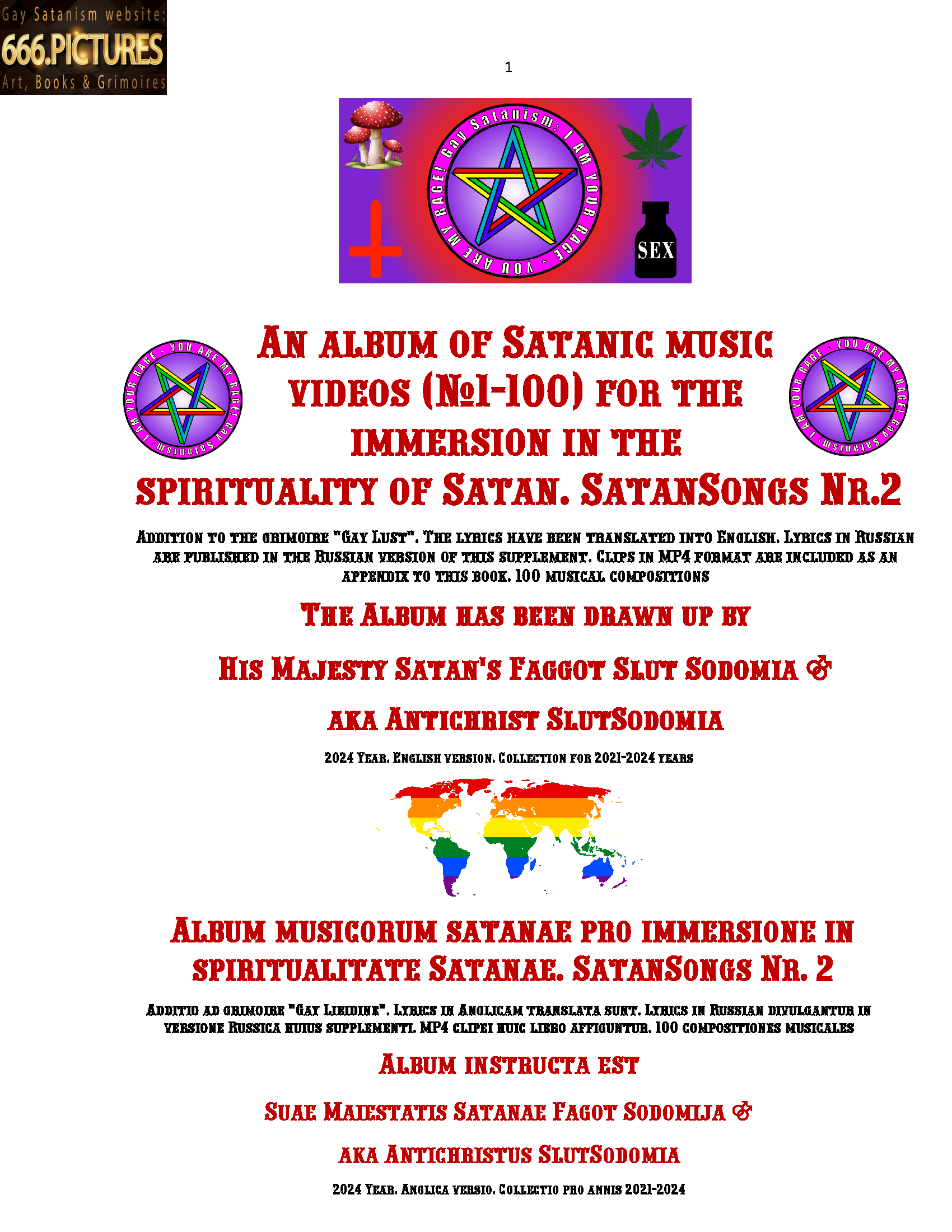 SatanSongs #2, a compilation album of Satanic music videos for immersion in the spirituality of Satan, begins with Anthem of the Grimoire of Gay Satanism, song No. 101. Joe’s performance “Manuscripts Don’t Burn.” This song is a warning to the evil that will ban and destroy copies of the grimoire “Gay Lust” written by the Antichrist Slut Sodomia. This hymn is dedicated specifically to the satanic grimoire “Gay Lust” itself, in contrast to the Anthem of Gay Satanism from SatanSongs No. 1. The main evil of our world is all states (or more precisely State Organized Criminal Groups), religions (or more precisely Charlatans of pseudo-spiritualization and servants of evil SOCG) and evil creatures not inspired by Satan (which constitute more than 90% of the population of Planet Earth). Our planet is very much engulfed in evil, and evil propaganda is broadcast from every TV and computer (maybe from an iron with an electric kettle, in the future 😊).