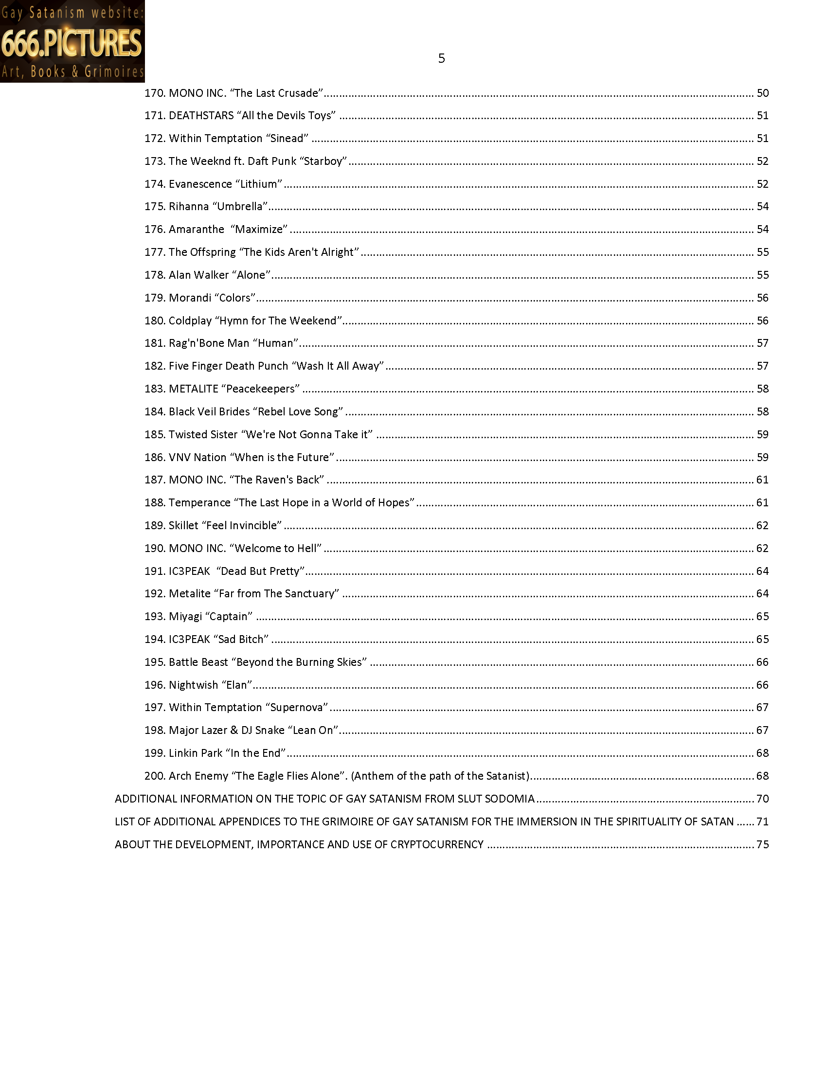 LIST OF ADDITIONAL APPENDICES TO THE GRIMOIRE OF GAY SATANISM FOR THE IMMERSION IN THE SPIRITUALITY OF SATAN 71