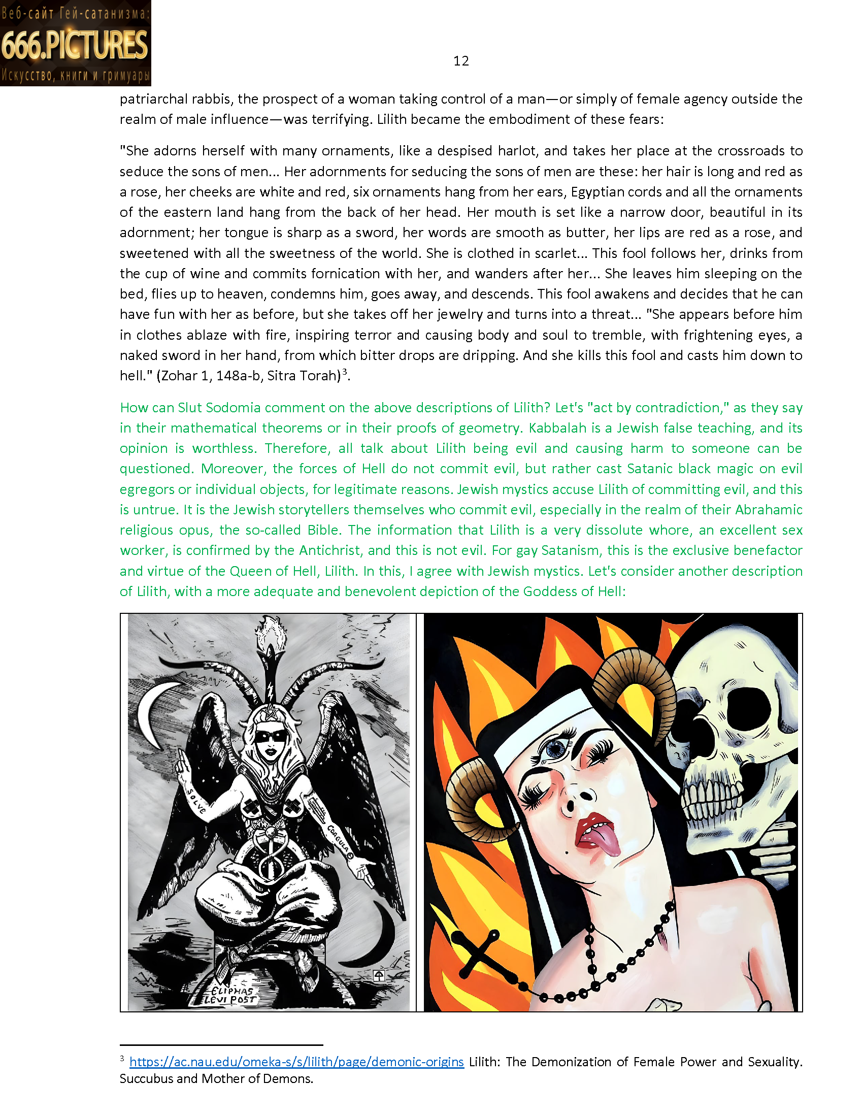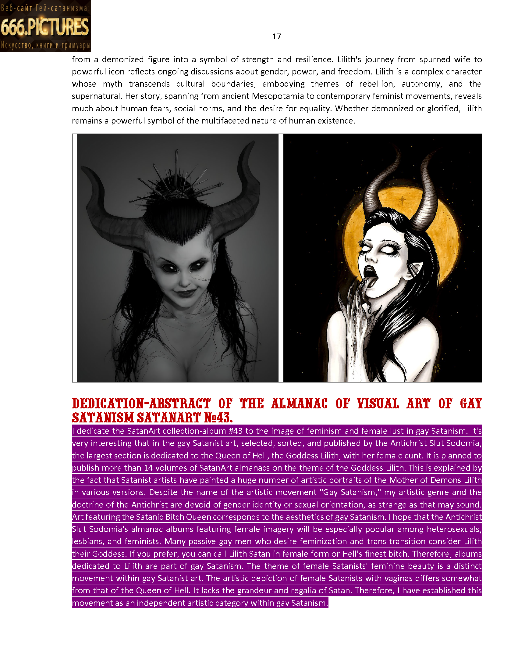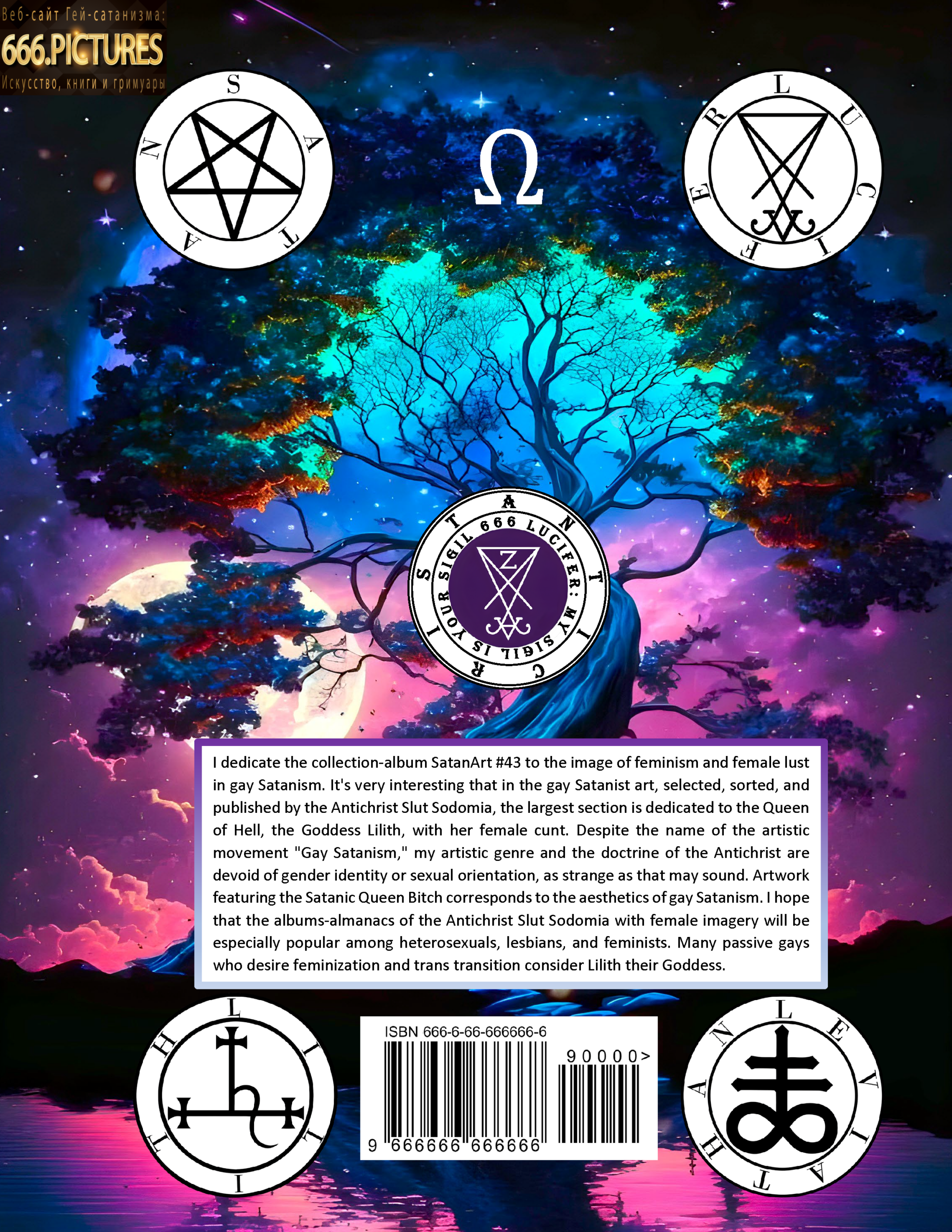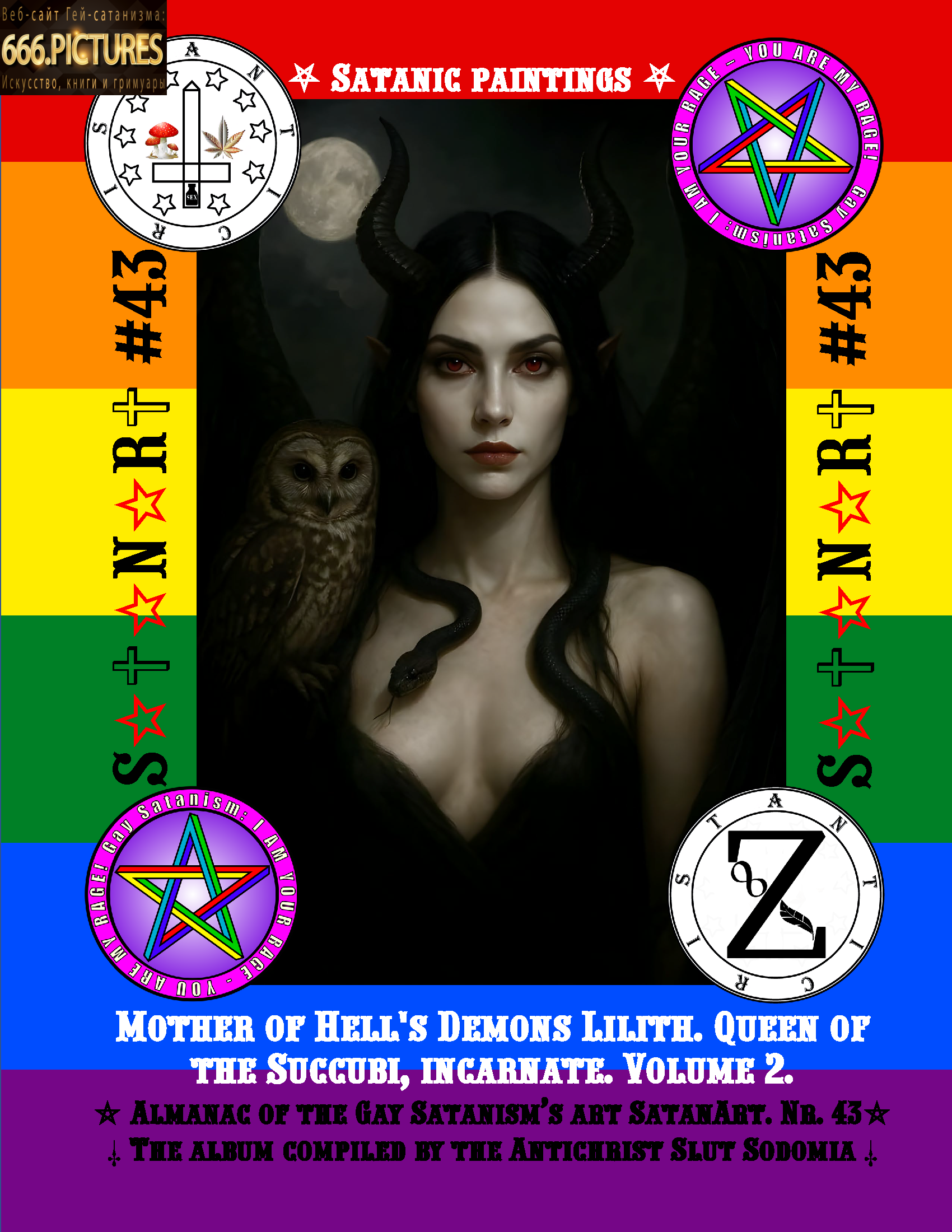 I dedicate the SatanArt collection-album #43 to the image of feminism and female lust in gay Satanism. It’s very interesting that in the gay Satanist art, selected, sorted, and published by the Antichrist Slut Sodomia, the largest section is dedicated to the Queen of Hell, the Goddess Lilith, with her female cunt. It is planned to publish more than 14 volumes of SatanArt almanacs on the theme of the Goddess Lilith. This is explained by the fact that Satanist artists have painted a huge number of artistic portraits of the Mother of Demons Lilith in various versions. Despite the name of the artistic movement “Gay Satanism,” my artistic genre and the doctrine of the Antichrist are devoid of gender identity or sexual orientation, as strange as that may sound. Art featuring the Satanic Bitch Queen corresponds to the aesthetics of gay Satanism. I hope that the Antichrist Slut Sodomia’s almanac albums featuring female imagery will be especially popular among heterosexuals, lesbians, and feminists. Many passive gay men who desire feminization and trans transition consider Lilith their Goddess. If you prefer, you can call Lilith Satan in female form or Hell’s finest bitch. Therefore, albums dedicated to Lilith are part of gay Satanism. The theme of female Satanists’ feminine beauty is a distinct movement within gay Satanist art. The artistic depiction of female Satanists with vaginas differs somewhat from that of the Queen of Hell. It lacks the grandeur and regalia of Satan. Therefore, I have established this movement as an independent artistic category within gay Satanism.
