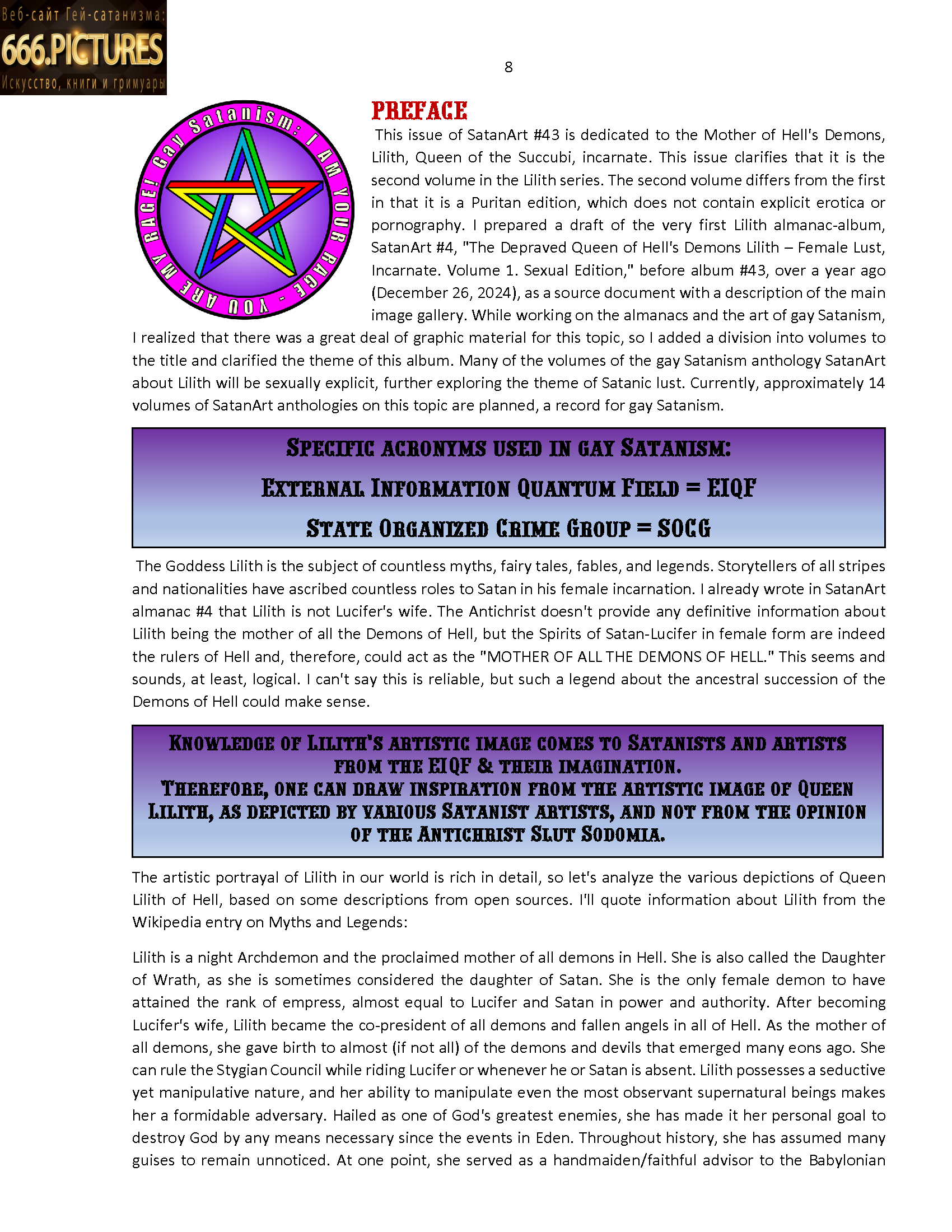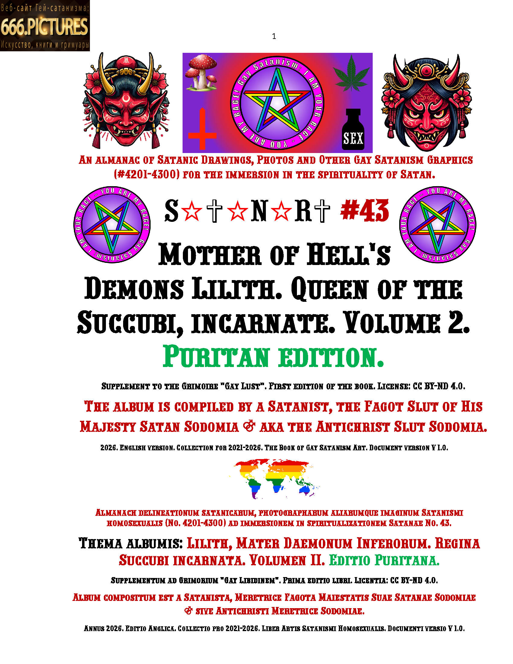 Supplement to the Grimoire “Gay Lust”. First edition of the book. The album is compiled by a Satanist, the Fagot Slut of His Majesty Satan Sodomia ⚣ aka the Antichrist Slut Sodomia. 2026. English version. Collection for 2021-2026. The Book of Gay Satanism Art. Document version V 1.0. While working on the almanacs and the art of gay Satanism, I realized that there was a great deal of graphic material for this topic, so I added a division into volumes to the title and clarified the theme of this album. Many of the volumes of the gay Satanism anthology SatanArt about Lilith will be sexually explicit, further exploring the theme of Satanic lust. Currently, approximately 14 volumes of SatanArt anthologies on this topic are planned, a record for gay Satanism.