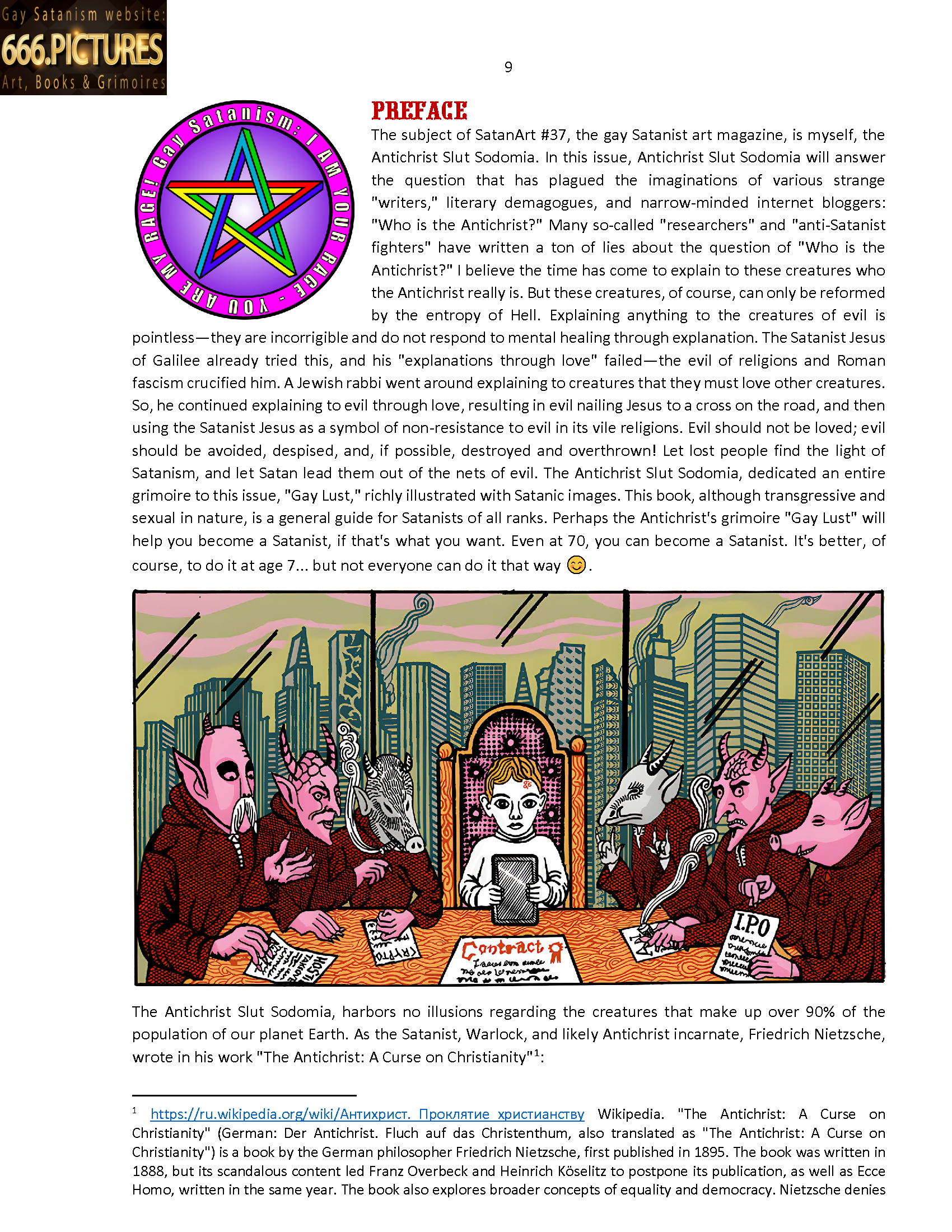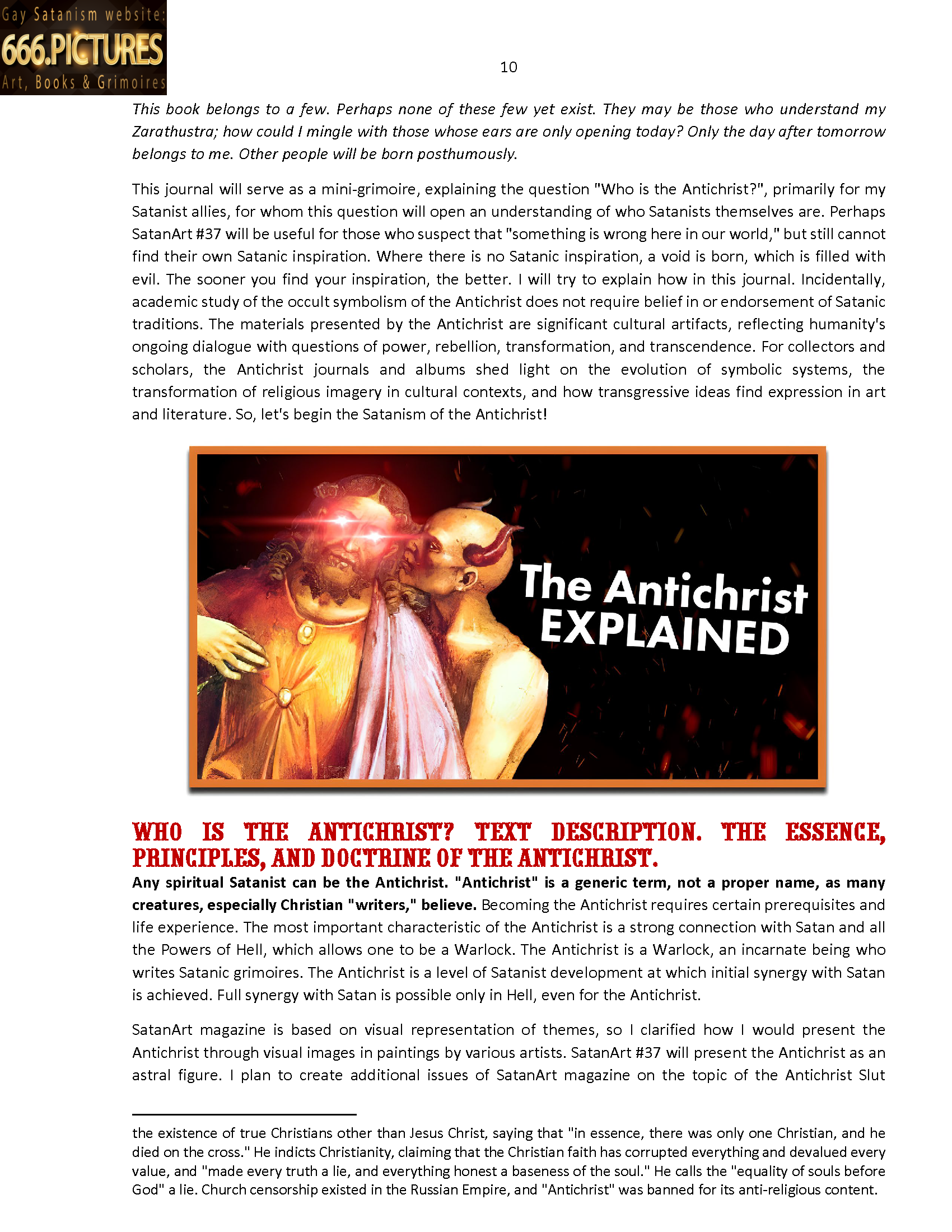The subject of SatanArt #37, the gay Satanist art magazine, is myself, the Antichrist Slut Sodomia. In this issue, Antichrist Slut Sodomia will answer the question that has plagued the imaginations of various strange “writers,” literary demagogues, and narrow-minded internet bloggers: “Who is the Antichrist?” Many so-called “researchers” and “anti-Satanist fighters” have written a ton of lies about the question of “Who is the Antichrist?” I believe the time has come to explain to these creatures who the Antichrist really is.