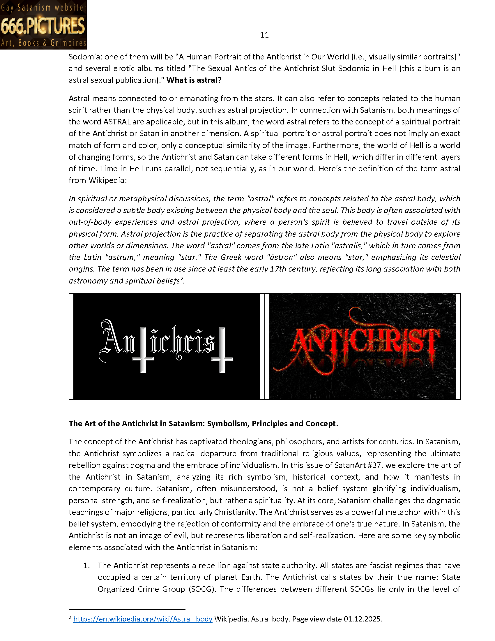 SatanArt magazine is based on visual representation of themes, so I clarified how I would present the Antichrist through visual images in paintings by various artists. SatanArt #37 will present the Antichrist as an astral figure. I plan to create additional issues of SatanArt magazine on the topic of the Antichrist Slut Sodomia: one of them will be “A Human Portrait of the Antichrist in Our World (i.e., visually similar portraits)” and several erotic albums titled “The Sexual Antics of the Antichrist Slut Sodomia in Hell (this album is an astral sexual publication).” What is astral?