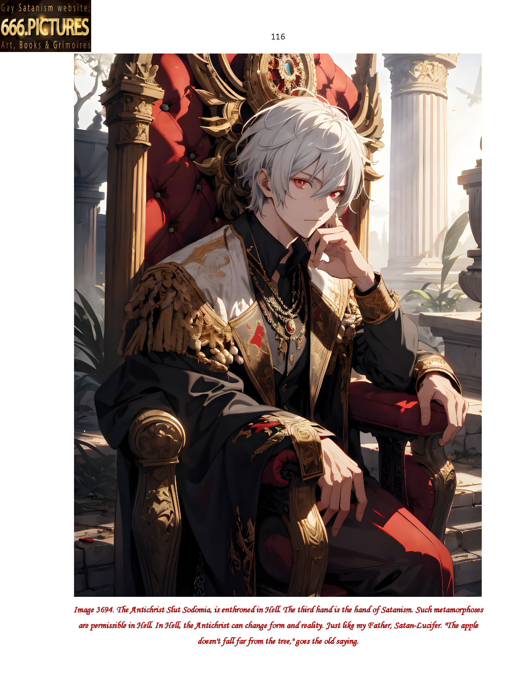 Image 3694. The Antichrist Slut Sodomia, is enthroned in Hell. The third hand is the hand of Satanism. Such metamorphoses are permissible in Hell. In Hell, the Antichrist can change form and reality. Just like my Father, Satan-Lucifer. “The apple doesn’t fall far from the tree,” goes the old saying. 116