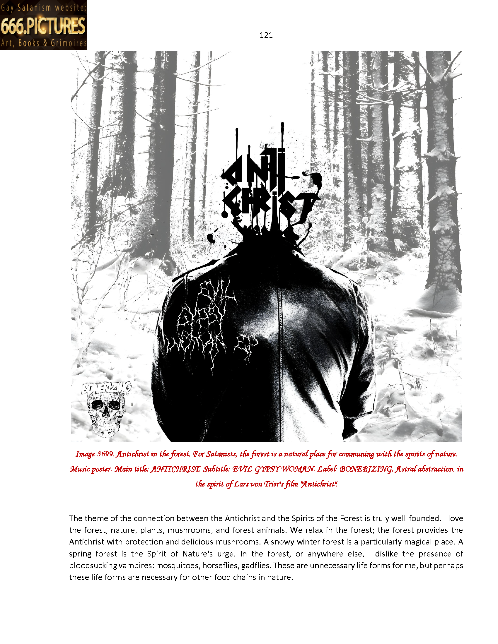 Image 3699. Antichrist in the forest. For Satanists, the forest is a natural place for communing with the spirits of nature. Music poster. Main title: ANTICHRIST. Subtitle: EVIL GYPSY WOMAN. Label: BONERIZING. Astral abstraction, in the spirit of Lars von Trier’s film “Antichrist”. 121