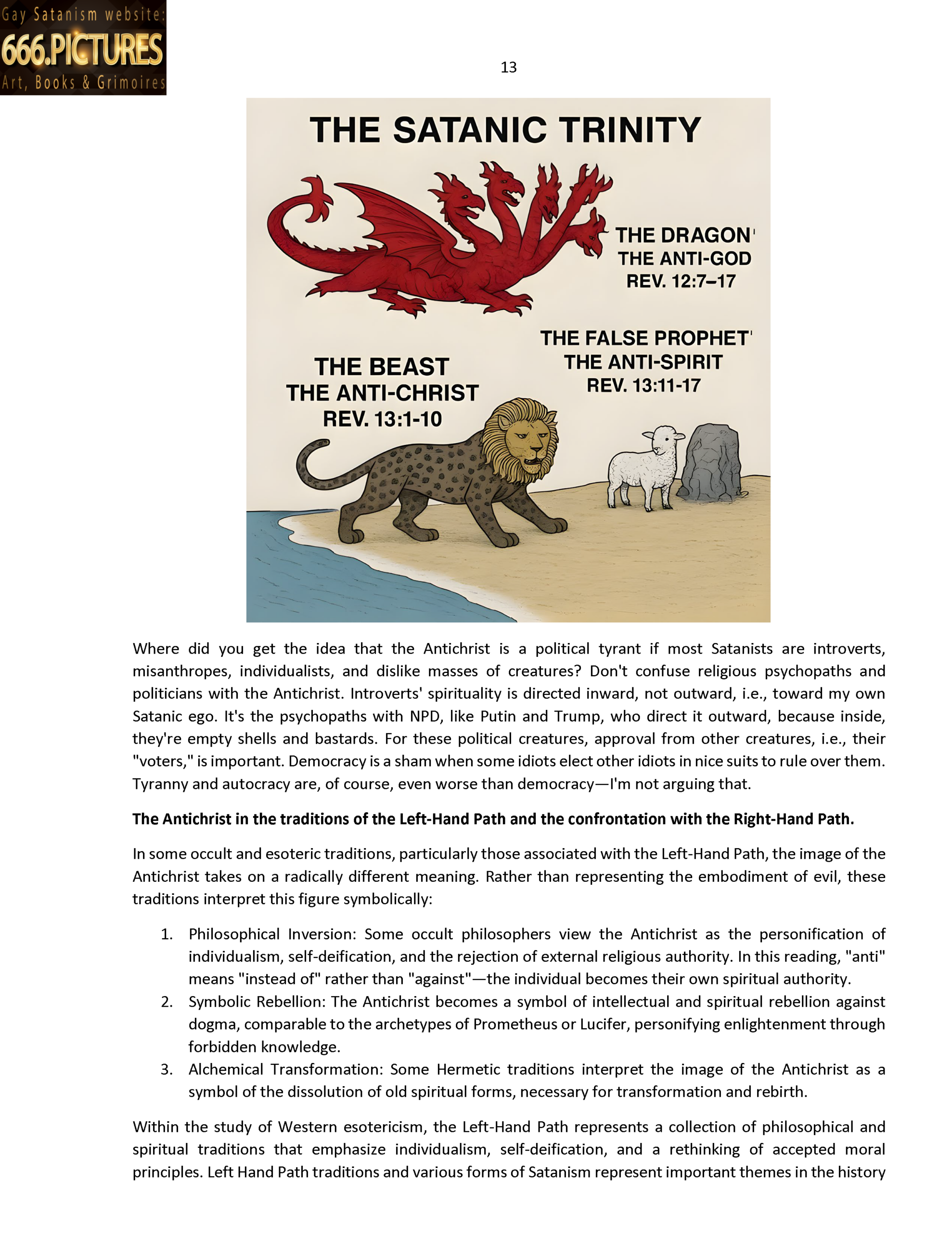 “Who is the Antichrist?” I believe the time has come to explain to these creatures who the Antichrist really is. But these creatures, of course, can only be reformed by the entropy of Hell. Explaining anything to the creatures of evil is pointless—they are incorrigible and do not respond to mental healing through explanation. The Satanist Jesus of Galilee already tried this, and his “explanations through love” failed—the evil of religions and Roman fascism crucified him. A Jewish rabbi went around explaining to creatures that they must love other creatures. So, he continued explaining to evil through love, resulting in evil nailing Jesus to a cross on the road, and then using the Satanist Jesus as a symbol of non-resistance to evil in its vile religions. Evil should not be loved; evil should be avoided, despised, and, if possible, destroyed and overthrown! Let lost people find the light of Satanism, and let Satan lead them out of the nets of evil. The Antichrist Slut Sodomia, dedicated an entire grimoire to this issue, “Gay Lust,” richly illustrated with Satanic images. This book, although transgressive and sexual in nature, is a general guide for Satanists of all ranks. Perhaps the Antichrist’s grimoire “Gay Lust” will help you become a Satanist, if that’s what you want. Even at 70, you can become a Satanist. It’s better, of course, to do it at age 7… but not everyone can do it that way 😊.