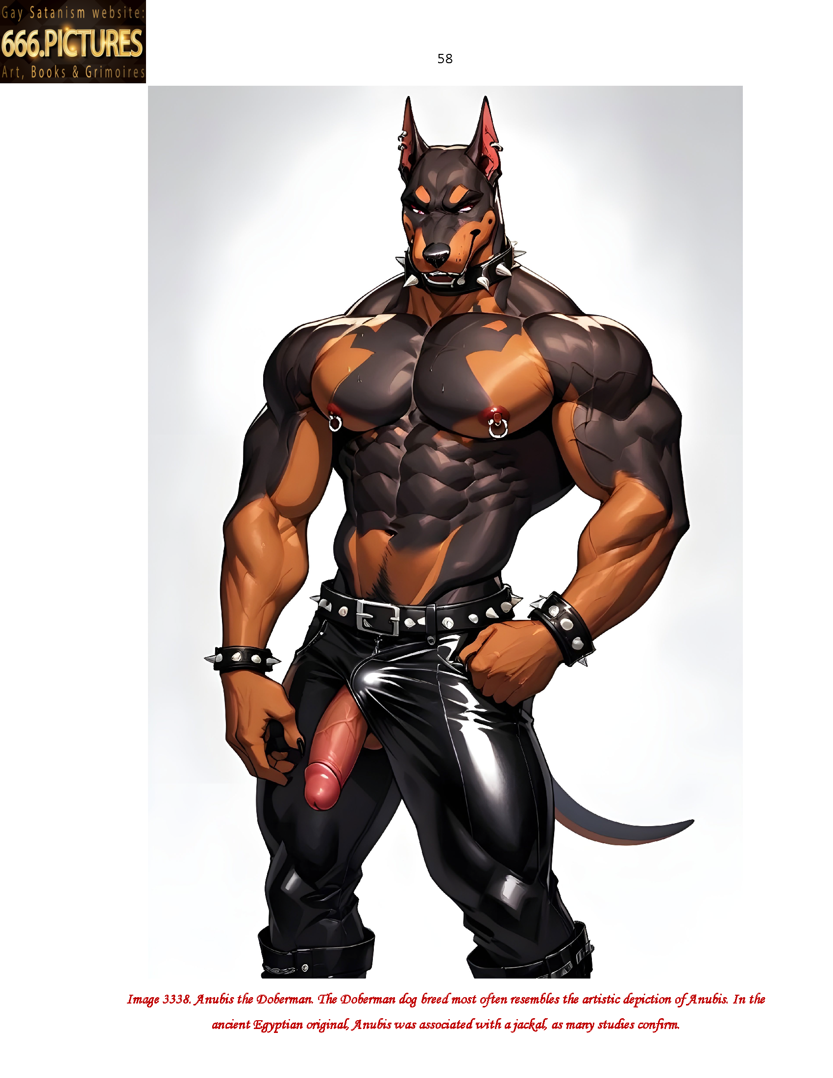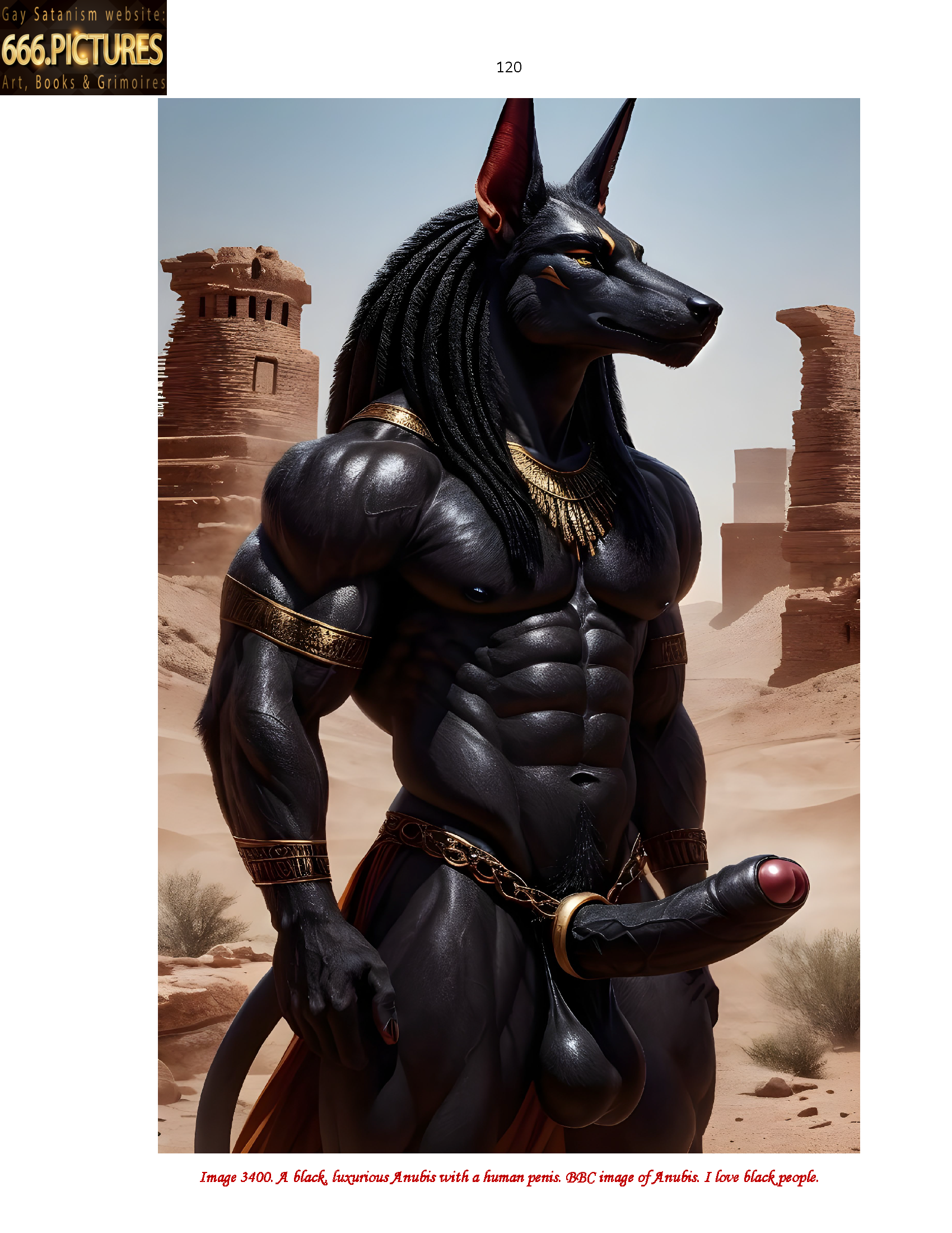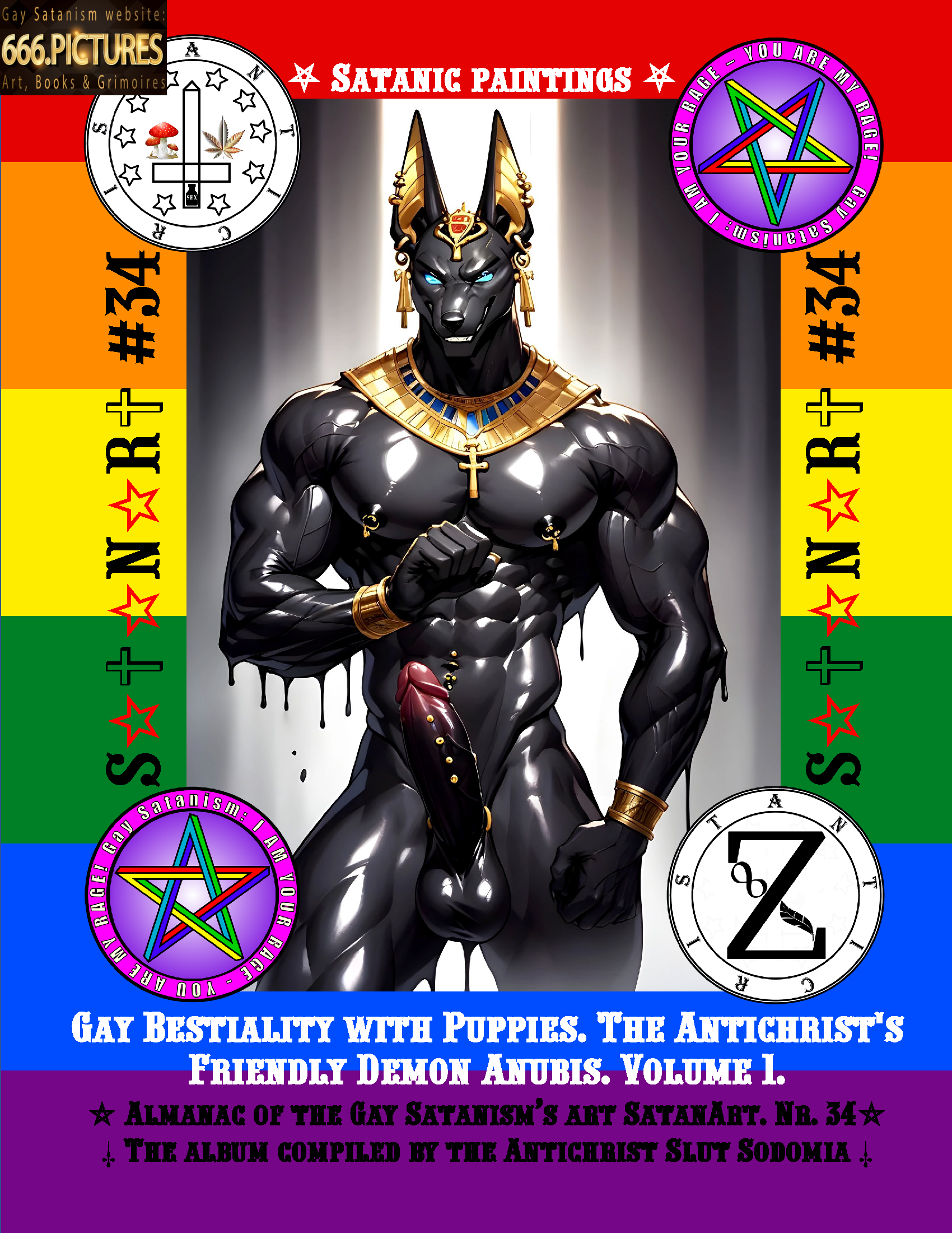 I dedicate SatanArt #34 to the theme of zoo-Satanism and puppy zoo-sex within the context of gay sex. I dedicate this SatanArt #34 to the emblem, canon, and “holy libertine of gay Satanism,” Anubis, the patron spirit of gay puppies (bottoms) and their gay handlers (tops). Anubis, often revered as the Lord of the Sacred and Master of Mysteries, is a key figure in Egyptian mythology. As the god of mummification, he highly valued his duties in preserving and caring for the dead. The peculiar combination of human and animal forms seen in Anubis’s depiction was a common practice in ancient Egyptian art. This fusion served to convey the divine nature of their deities, combining the physical attributes of animals with the intellectual abilities of humans. This allowed the Egyptians to convey complex ideas about their gods, imbuing them with characteristics associated with specific animals. For modern people and the human race of the future, Anubis may become a symbol of gay zoophilia. I hope the paintings and drawings of Anubis, which were selected by the Antichrist, will be of interest to everyone. I remind the reader that there is nothing wrong with zoophilia, and the negative image of sexual (and other) love for animals is shaped by evil, as moral dogmas for the rabble. Zoophilia is part of your freedom, on the path to Paradise in this world. Evil prohibits anything that could bring Paradise back to our world—remember this.