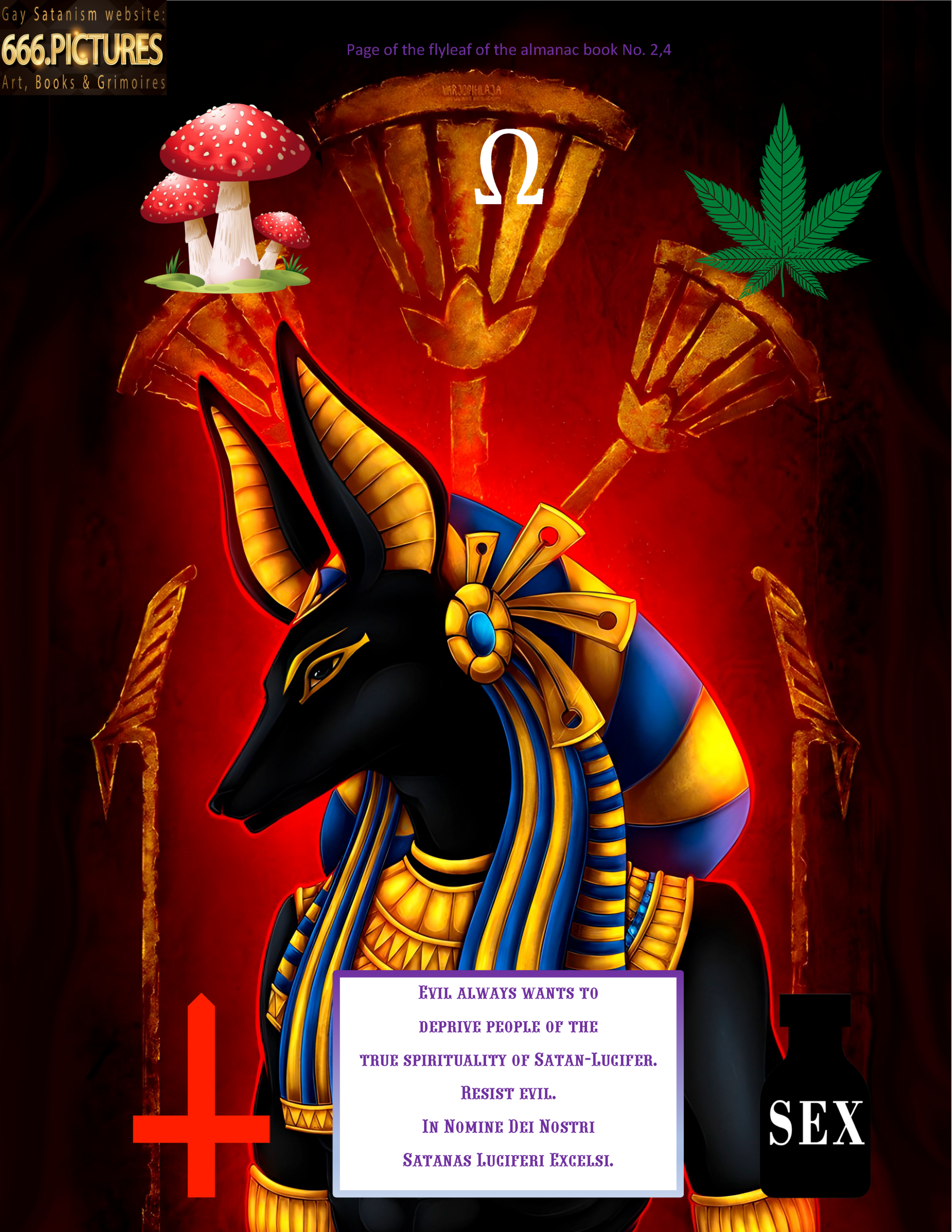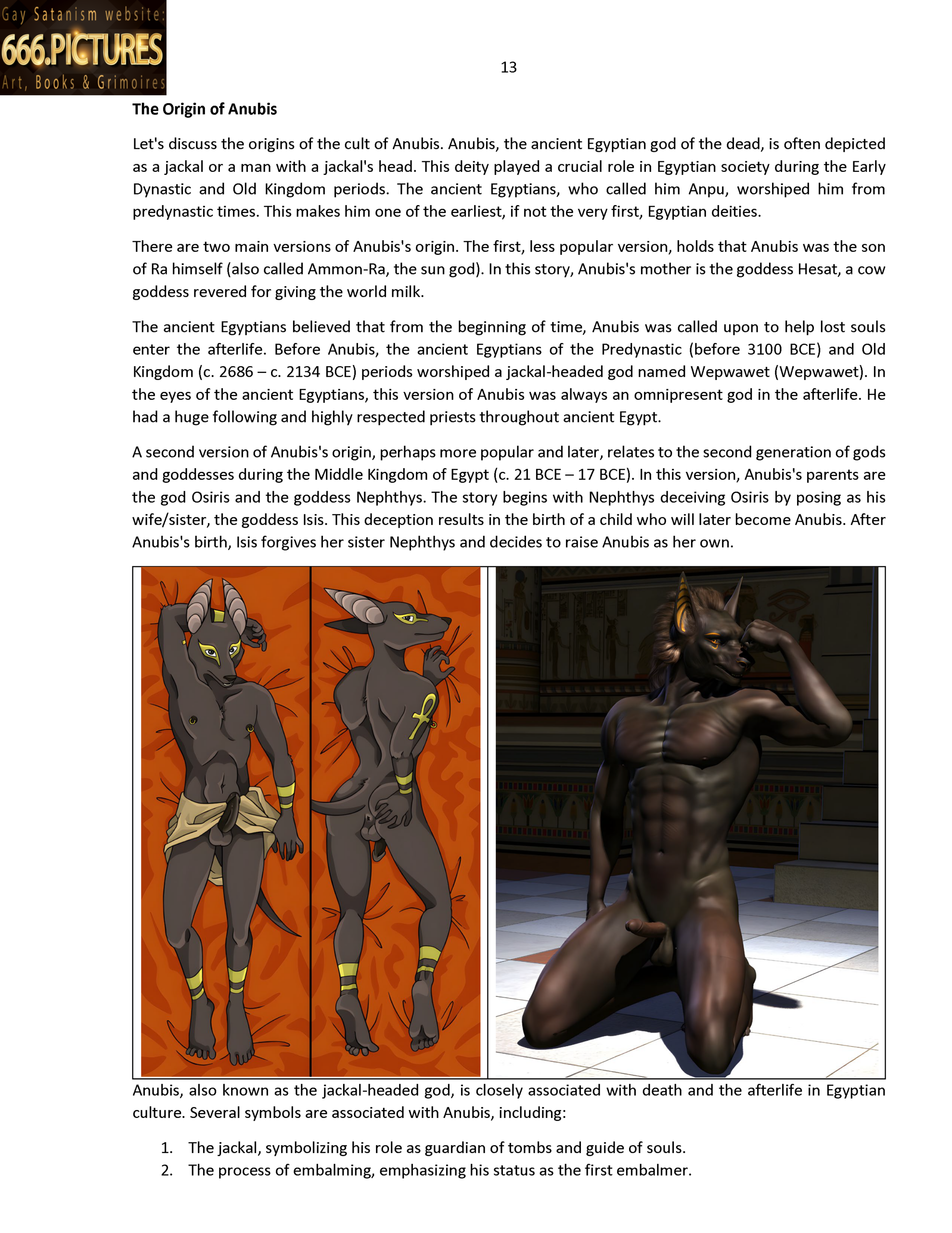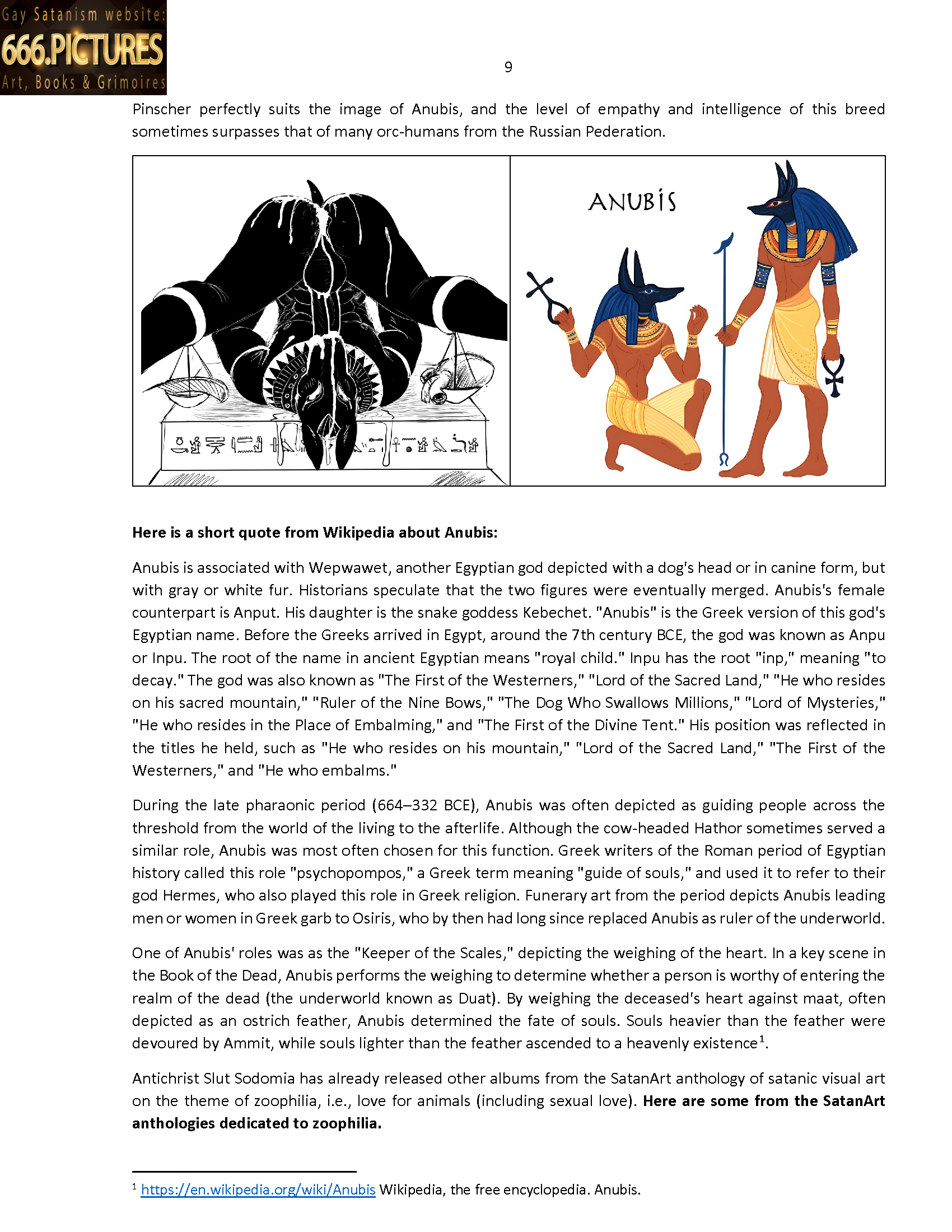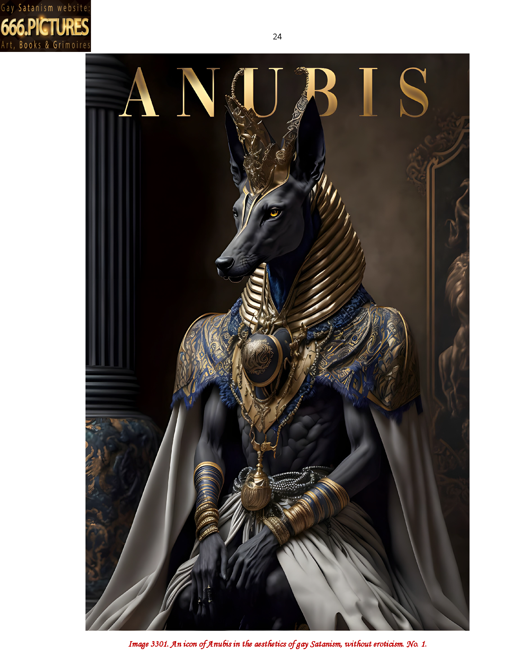 I dedicate SatanArt #34 to the theme of zoo-Satanism and puppy zoo-sex within the context of gay sex. I dedicate this SatanArt #34 to the emblem, canon, and “holy libertine of gay Satanism,” Anubis, the patron spirit of gay puppies (bottoms) and their gay handlers (tops). Anubis, often revered as the Lord of the Sacred and Master of Mysteries, is a key figure in Egyptian mythology. As the god of mummification, he highly valued his duties in preserving and caring for the dead. The peculiar combination of human and animal forms seen in Anubis’s depiction was a common practice in ancient Egyptian art. This fusion served to convey the divine nature of their deities, combining the physical attributes of animals with the intellectual abilities of humans. This allowed the Egyptians to convey complex ideas about their gods, imbuing them with characteristics associated with specific animals. For modern people and the human race of the future, Anubis may become a symbol of gay zoophilia. I hope the paintings and drawings of Anubis, which were selected by the Antichrist, will be of interest to everyone. I remind the reader that there is nothing wrong with zoophilia, and the negative image of sexual (and other) love for animals is shaped by evil, as moral dogmas for the rabble. Zoophilia is part of your freedom, on the path to Paradise in this world. Evil prohibits anything that could bring Paradise back to our world—remember this.