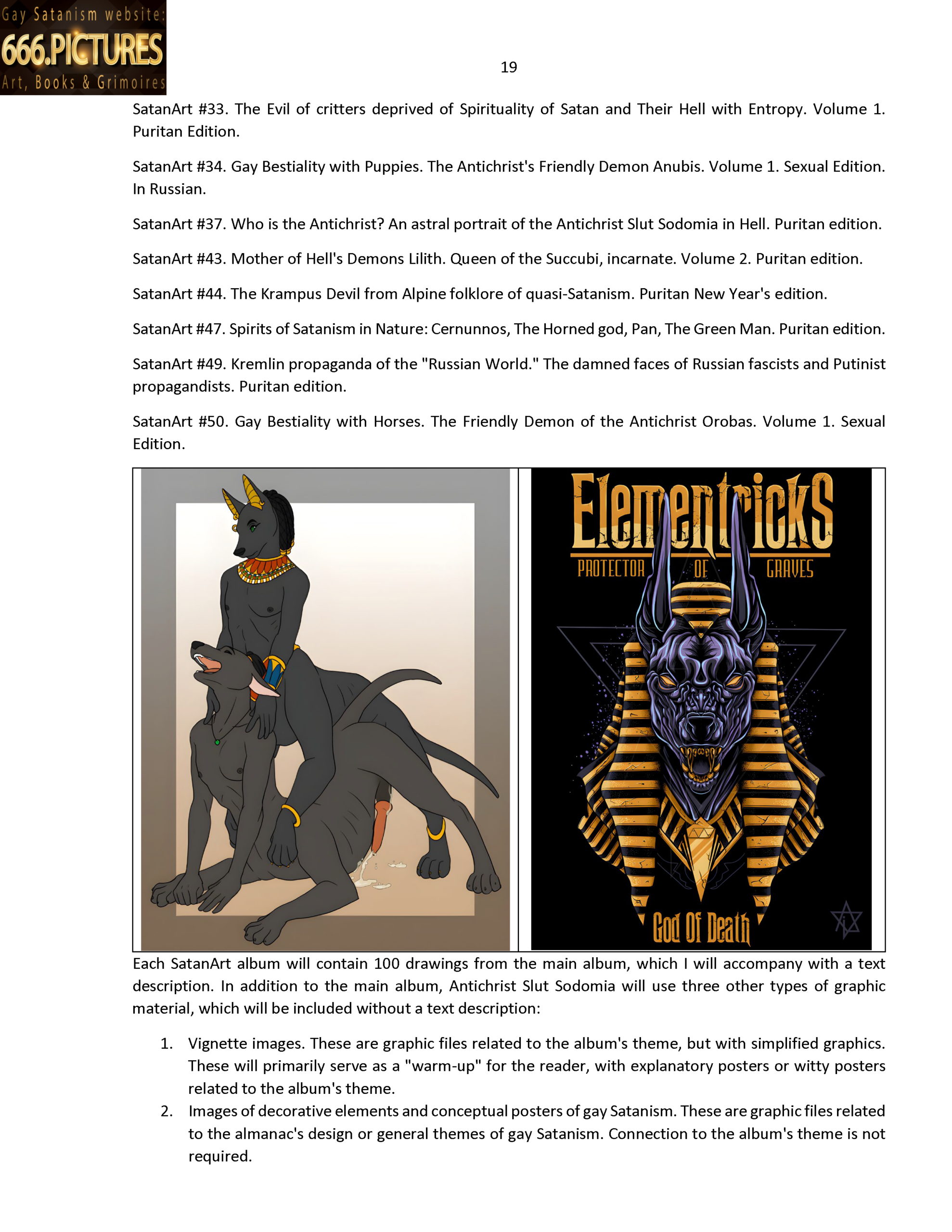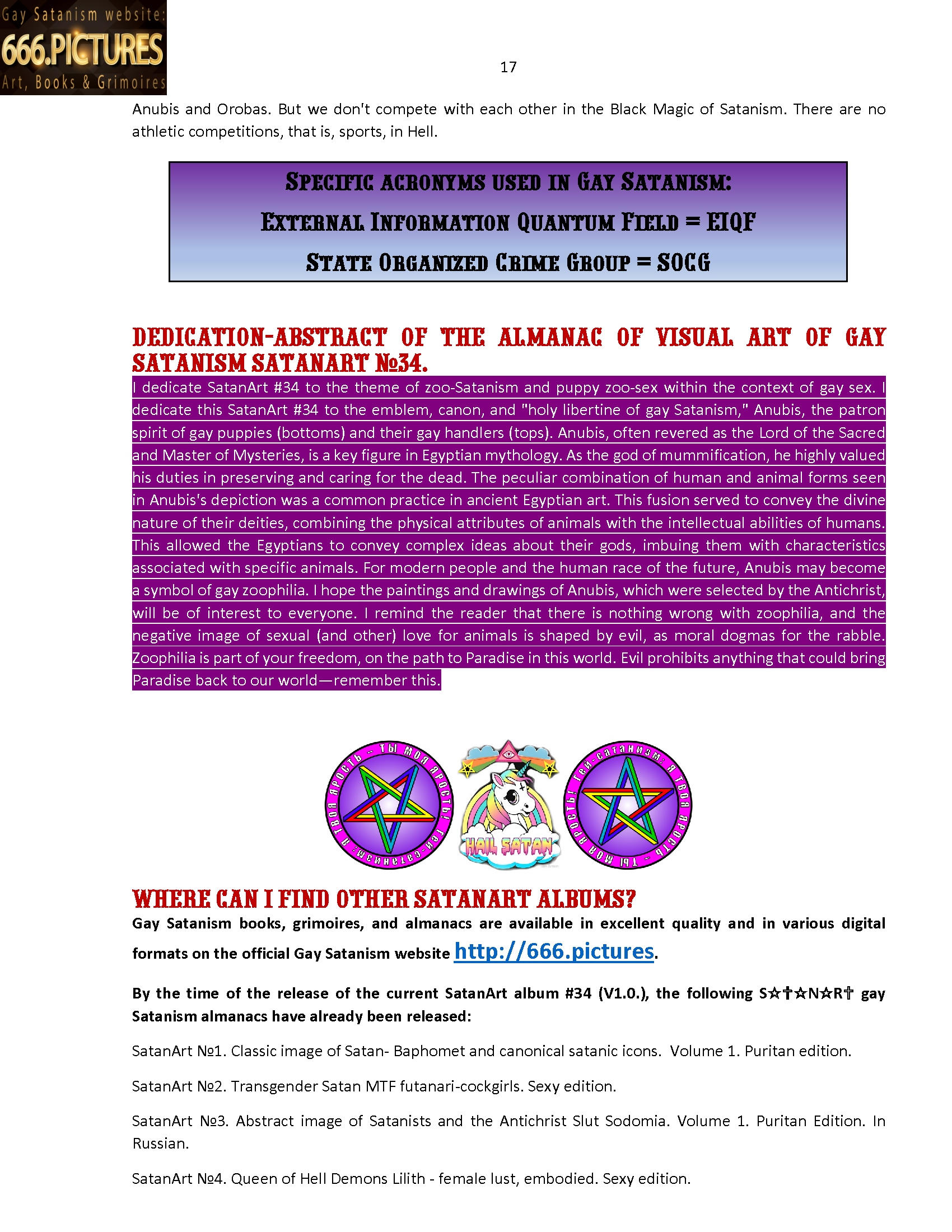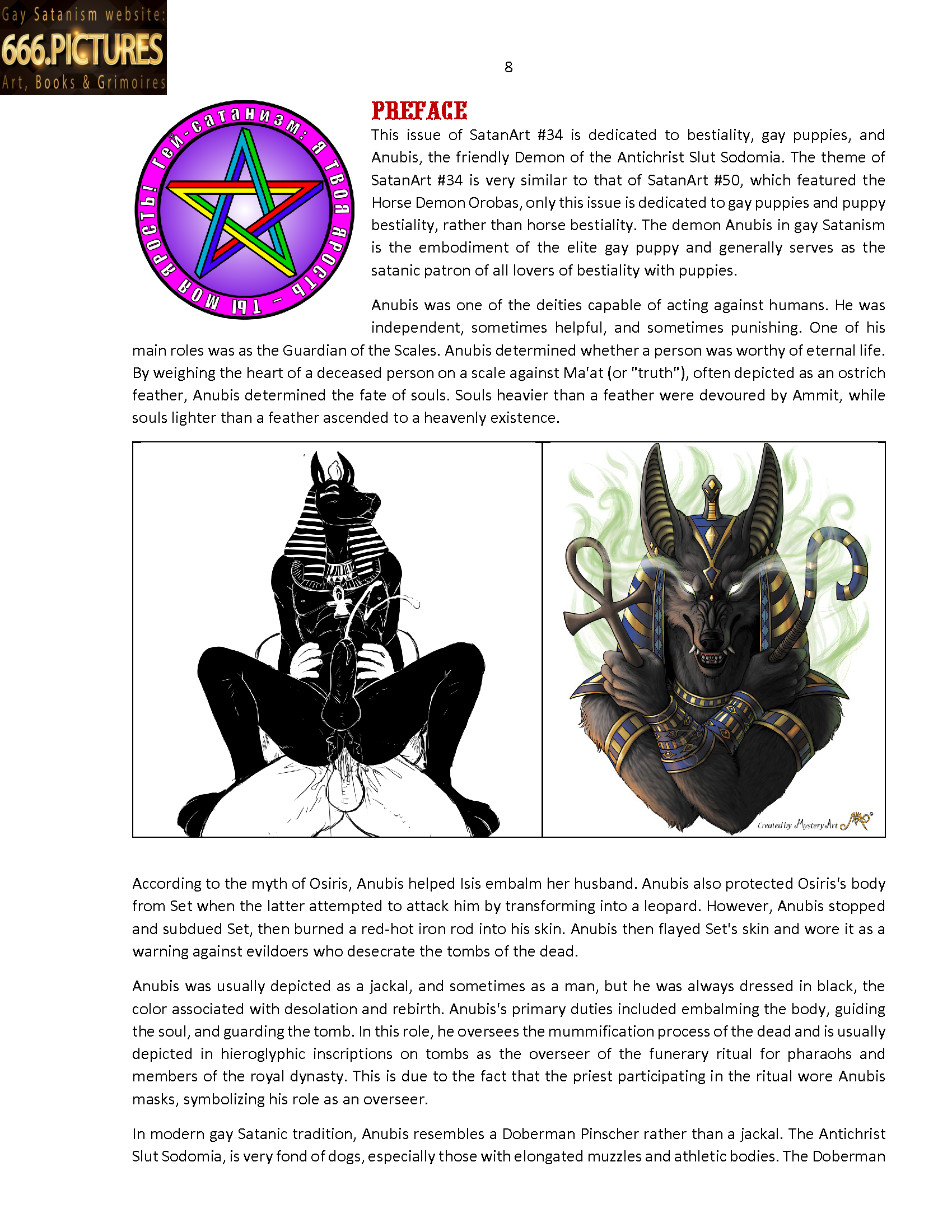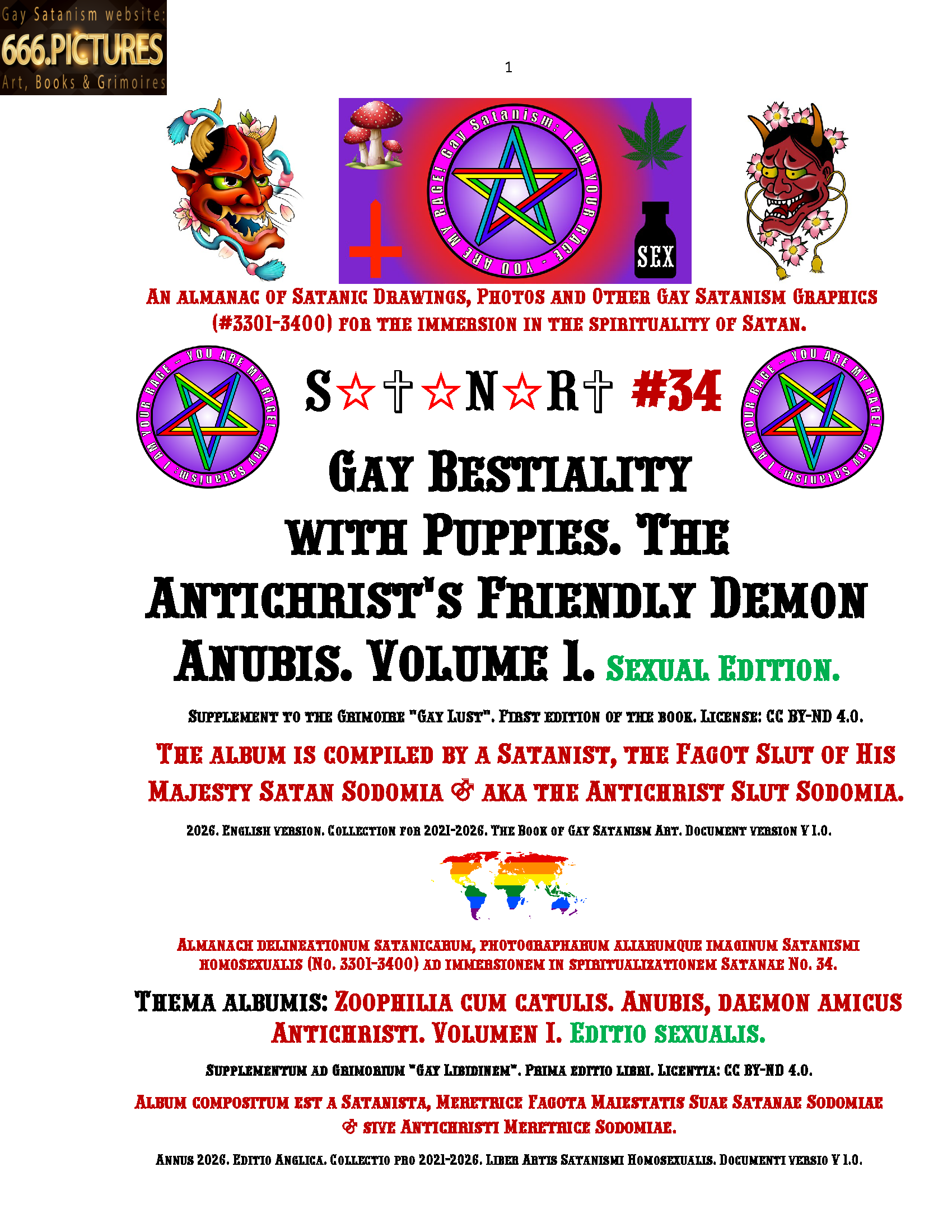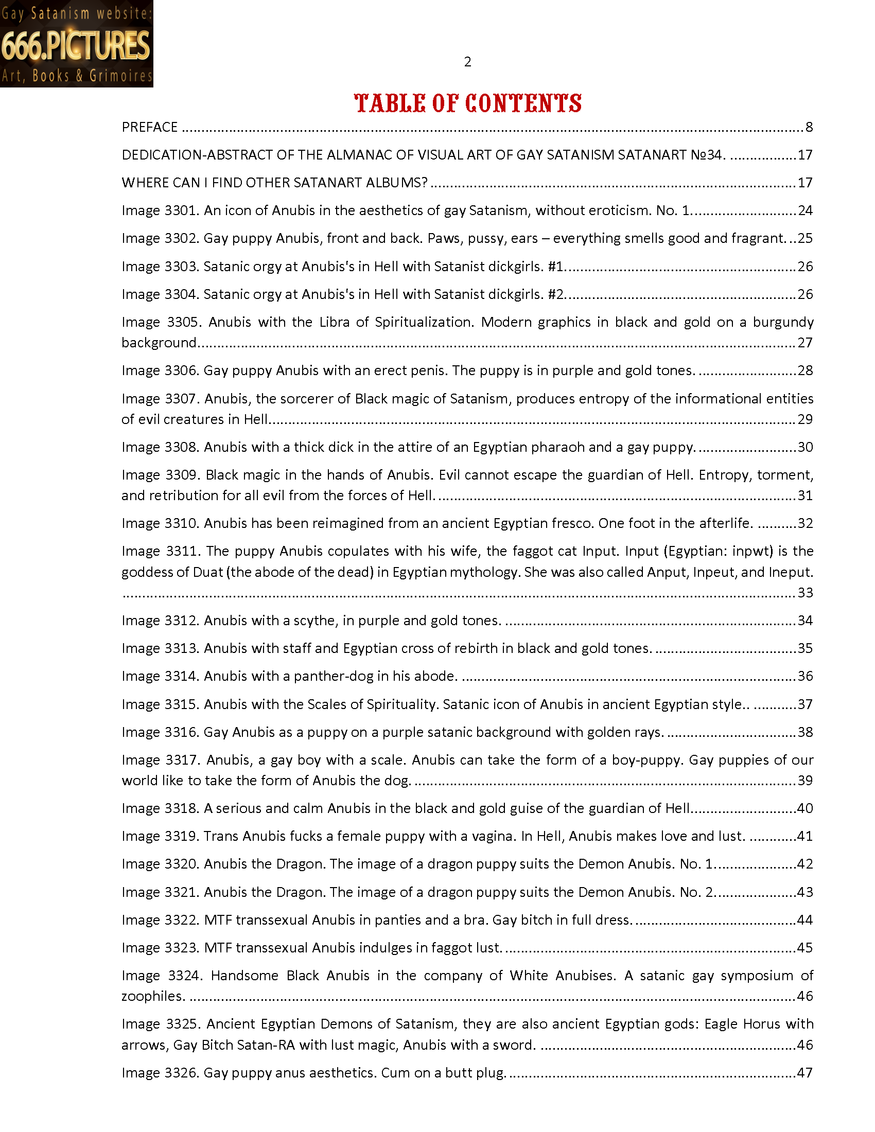 The Antichrist’s satanic almanac SatanArt. Nr. 34: Gay Bestiality with Puppies. The Antichrist’s Friendly Demon Anubis. Volume 1. Sexual Edition TABLE OF CONTENTS
